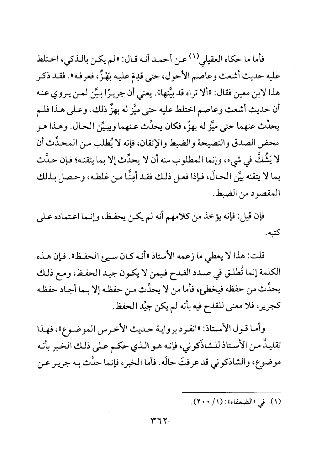 فأما ما حكاه العقيلي (¬١) عن أحمد أنه قال: «لم يكن بالذكي، اختلط عليه حديث أشعث وعاصم الأحول، حتى قدِمَ عليه بَهْزٌ، فعرفه». فقد ذكر هذا لابن معين فقال: «ألا تراه قد بيَّنها». يعني أن جريرًا بيَّن لمن يروي عنه أن حديث أشعث وعاصم اختلط عليه حتى ميَّز له بهزٌ ذلك. وعلى هذا فلم يحدِّث عنهما حتى ميَّز له بهزٌ، فكان يحدِّث عنهما ويبيِّن الحال. وهذا هو محض الصدق والنصيحة والضبط والإتقان، فإنه لا يُطلب من المحدِّث أن لا يَشُكَّ في شيء، وإنما المطلوب منه أن لا يحدِّث إلا بما يتقنه؛ فإن حدَّث بما لا يتقنه بيَّن الحالَ، فإذا فعل ذلك فقد أمِنَّا من غلطه، وحصل بذلك المقصود من الضبط.