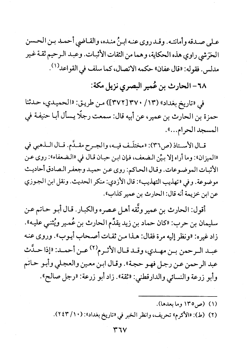قال الأستاذ (ص ٣٦): «مختلَف فيه، والجرح مقدَّم. قال الذهبي في «الميزان»: وما أراه إلا بيِّن الضعف، فإن ابن حبان قال في «الضعفاء»: روى عن الأثبات الموضوعات. وقال الحاكم: روى عن حميد وجعفر الصادق أحاديث موضوعة. وفي «تهذيب التهذيب»: قال الأزدي: منكر الحديث. ونقل ابن الجوزي عن ابن خزيمة أنه قال: الحارث بن عمير كذاب».
