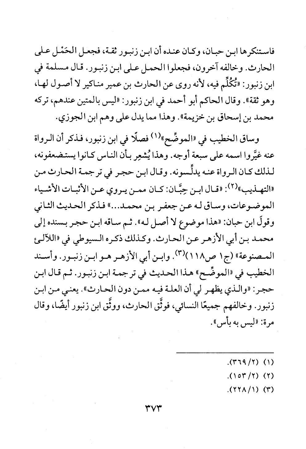 وساق الخطيب في «الموضِّح» (¬١) فصلًا في ابن زنبور، فذكر أن الرواة عنه غيَّروا اسمه على سبعة أوجه. وهذا يُشعِر بأن الناس كانوا يستضعفونه، لذلك كان الرواة عنه يدلِّسونه. وقال ابن حجر في ترجمة الحارث من «التهذيب» (¬٢): «قال ابن حِبَّان: كان ممن يروي عن الأثبات الأشياء الموضوعات، وساق له عن جعفر بن محمد ... » فذكر الحديث الثاني وقولَ ابن حبان: «هذا موضوع لا أصل له». ثم ساقه ابن حجر بسنده إلى محمد بن أبي الأزهر عن الحارث. وكذلك ذكره السيوطي في «اللآلئ المصنوعة» (ج ١ ص ١١٨) (¬٣). وابن أبي الأزهر هو ابن زنبور. وأسند الخطيب في «الموضِّح» هذا الحديث في ترجمة ابن زنبور. ثم قال ابن حجر: «والذي يظهر لي أن العلة فيه ممن دون الحارث». يعني من ابن زنبور. وخالفهم جميعًا النسائي، فوثَّق الحارث، ووثَّق ابن زنبور أيضًا، وقال مرة: «ليس به بأس».