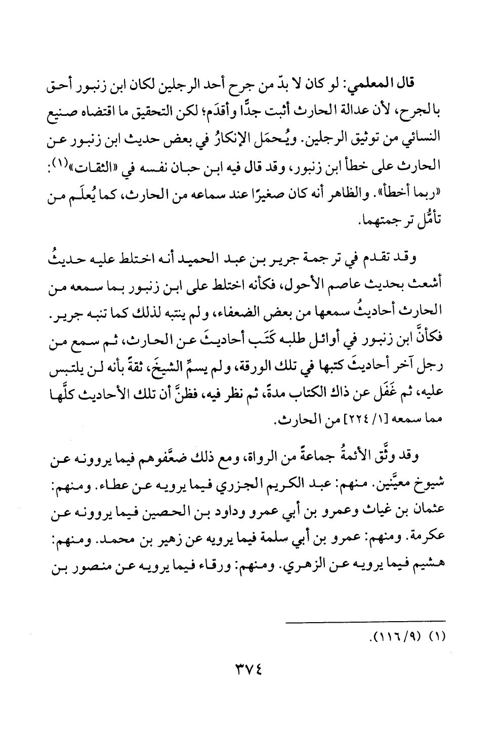 قال المعلمي: لو كان لا بدّ من جرح أحد الرجلين لكان ابن زنبور أحق بالجرح، لأن عدالة الحارث أثبت جدًّا وأقدَم؛ لكن التحقيق ما اقتضاه صنيع النسائي من توثيق الرجلين. ويُحمَل الإنكارُ في بعض حديث ابن زنبور عن الحارث على خطأ ابن زنبور، وقد قال فيه ابن حبان نفسه في «الثقات» (¬١): «ربما أخطأ». والظاهر أنه كان صغيرًا عند سماعه من الحارث، كما يُعلَم من تأمُّل ترجمتهما.