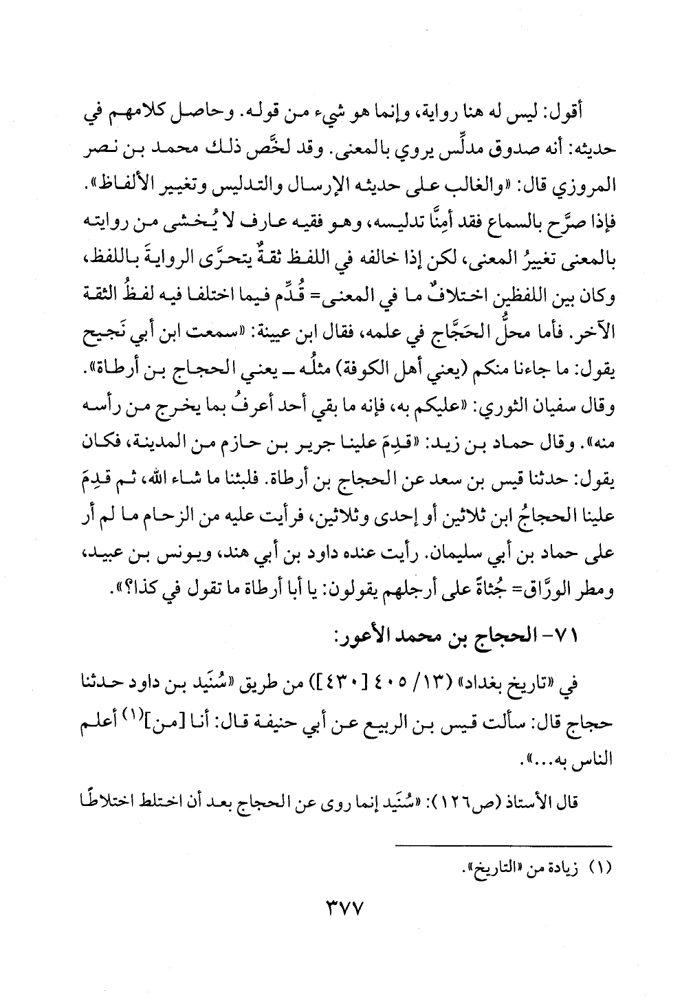 أقول: ليس له هنا رواية، وإنما هو شيء من قوله. وحاصل كلامهم في حديثه: أنه صدوق مدلِّس يروي بالمعنى. وقد لخَّص ذلك محمد بن نصر المروزي قال: «والغالب على حديثه الإرسال والتدليس وتغيير الألفاظ». فإذا صرَّح بالسماع فقد أمِنَّا تدليسه، وهو فقيه عارف لا يُخشى من روايته بالمعنى تغييرُ المعنى، لكن إذا خالفه في اللفظ ثقةٌ يتحرَّى الروايةَ باللفظ، وكان بين اللفظين اختلافٌ ما في المعنى= قُدِّم فيما اختلفا فيه لفظُ الثقة الآخر. فأما محلُّ الحَجَّاج في علمه، فقال ابن عيينة: «سمعت ابن أبي نَجيح يقول: ما جاءنا منكم (يعني أهل الكوفة) مثلُه ــ يعني الحجاج بن أرطاة». وقال سفيان الثوري: «عليكم به، فإنه ما بقي أحد أعرفُ بما يخرج من رأسه منه». وقال حماد بن زيد: «قدِمَ علينا جرير بن حازم من المدينة، فكان يقول: حدثنا قيس بن سعد عن الحجاج بن أرطاة. فلبثنا ما شاء الله، ثم قدِمَ علينا الحجاجُ ابن ثلاثين أو إحدى وثلاثين، فرأيت عليه من الزحام ما لم أر على حماد بن أبي سليمان. رأيت عنده داود بن أبي هند، ويونس بن عبيد، ومطر الورَّاق= جُثاةً على أرجلهم يقولون: يا أبا أرطاة ما تقول في كذا؟».