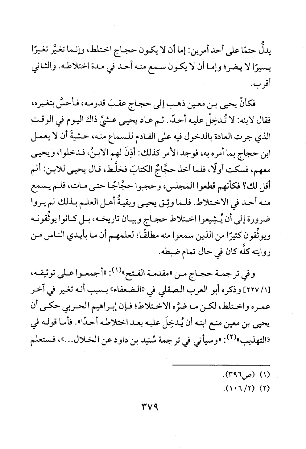 فكأنّ يحيى بن معين ذهب إلى حجاج عقبَ قدومه، فأحسَّ بتغيره، فقال لابنه: لا تُدخِلْ عليه أحدًا. ثم عاد يحيى عشيَّ ذاك اليوم في الوقت الذي جرت العادة بالدخول فيه على القادم للسماع منه، خشيةَ أن لا يعمل ابن حجاج بما أمره به، فوجد الأمر كذلك: أذِنَ لهم الابنُ، فدخلوا، ويحيى معهم، فسكت أولًا، فلما أخذ حجَّاجٌ الكتابَ فخلَّط، قال يحيى للابن: ألم أقل لك؟ فكأنهم قطعوا المجلس، وحجبوا حجَّاجًا حتى مات، فلم يسمع منه أحد في الاختلاط. فلما وثِق يحيى وبقيةُ أهل العلم بذلك لم يروا ضرورة إلى أن يُشِيعوا اختلاط حجاج وبيان تاريخه، بل كانوا يوثِّقونه ويوثِّقون كثيرًا من الذين سمعوا منه مطلقًا؛ لعلمهم أن ما بأيدي الناس من روايته كلَّه كان في حال تمام ضبطه.