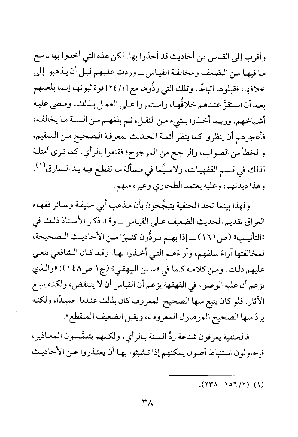 ولهذا بينما تجد الحنفية يتبجَّحون بأن مذهب أبي حنيفة وسائر فقهاء العراق تقديم الحديث الضعيف على القياس ــ وقد ذكر الأستاذ ذلك في "التأنيب" (ص ١٦١) ــ إذا بهم يردُّون كثيرًا من الأحاديث الصحيحة، لمخالفتها آراءَ سلفهم، وآراءَهم التي أخذوا بها. وقد كان الشافعي ينعى عليهم ذلك. ومن كلامه كما في "سنن البيهقي" (ج ١ ص ١٤٨): "والذي يزعم أن عليه الوضوء في القهقهة يزعم أن القياس أن لا ينتقض، ولكنه يتبع الآثار. فلو كان يتبع منها الصحيح المعروف كان بذلك عندنا حميدًا، ولكنه يردّ منها الصحيح الموصول المعروف، ويقبل الضعيف المنقطع".
