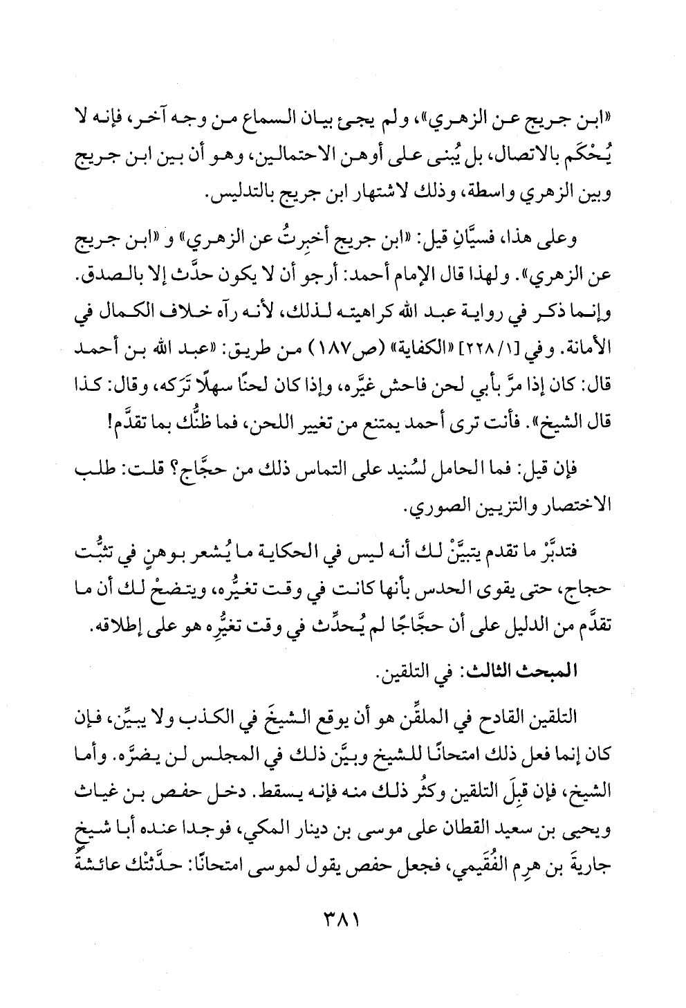 وعلى هذا، فسيَّانِ قيل: «ابن جريج أخبِرتُ عن الزهري» و «ابن جريج عن الزهري». ولهذا قال الإمام أحمد: أرجو أن لا يكون حدَّث إلا بالصدق. وإنما ذكر في رواية عبد الله كراهيته لذلك، لأنه رآه خلاف الكمال في الأمانة. وفي [١/ ٢٢٨] «الكفاية» (ص ١٨٧) من طريق: «عبد الله بن أحمد قال: كان إذا مرَّ بأبي لحن فاحش غيَّره، وإذا كان لحنًا سهلًا تَرَكه، وقال: كذا قال الشيخ». فأنت ترى أحمد يمتنع من تغيير اللحن، فما ظنُّك بما تقدَّم!
