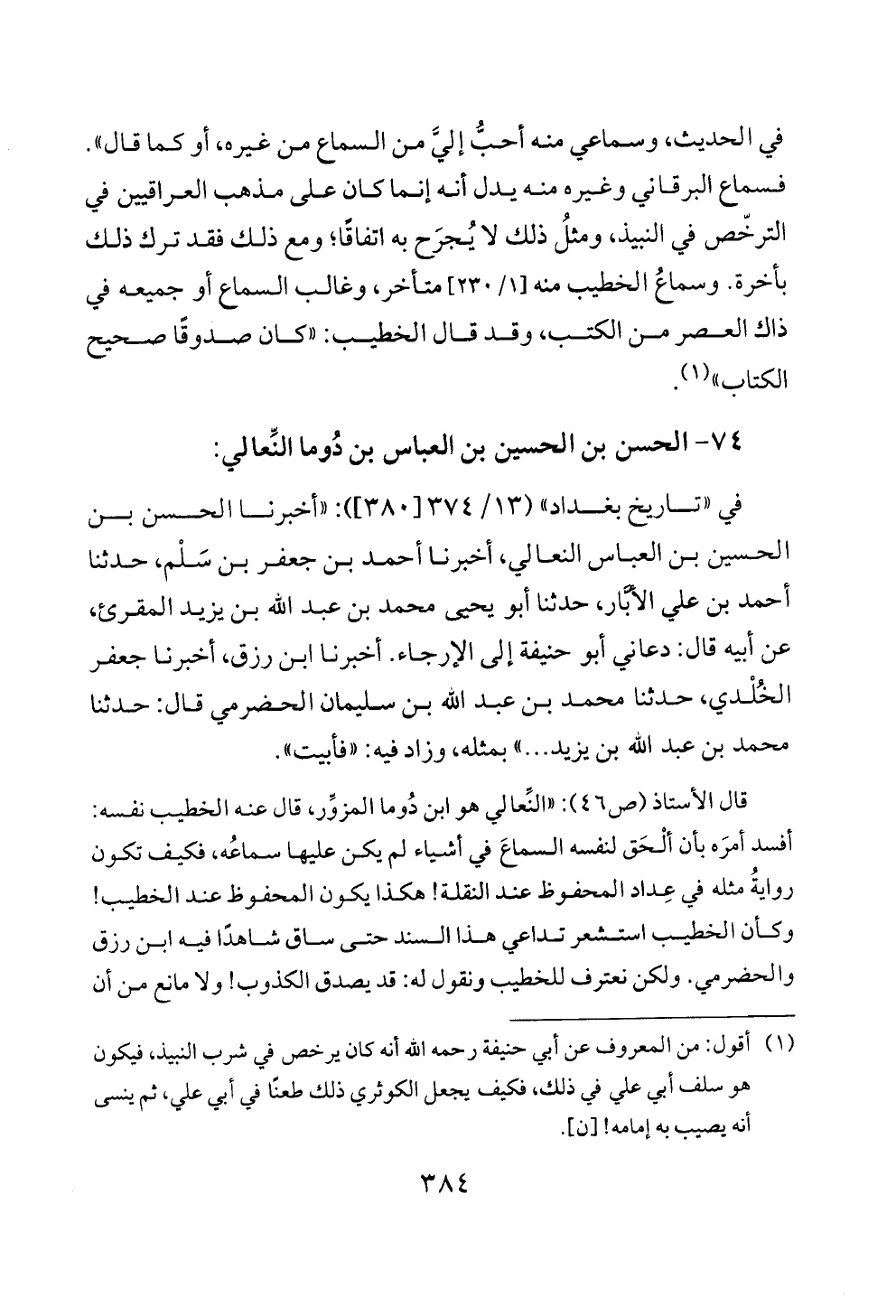 قال الأستاذ (ص ٤٦): «النِّعالي هو ابن دُوما المزوِّر، قال عنه الخطيب نفسه: أفسد أمرَه بأن ألْحَق لنفسه السماعَ في أشياء لم يكن عليها سماعُه، فكيف تكون روايةُ مثله في عِداد المحفوظ عند النقلة! هكذا يكون المحفوظ عند الخطيب! وكأن الخطيب استشعر تداعي هذا السند حتى ساق شاهدًا فيه ابن رزق والحضرمي. ولكن نعترف للخطيب ونقول له: قد يصدق الكذوب! ولا مانع من أن