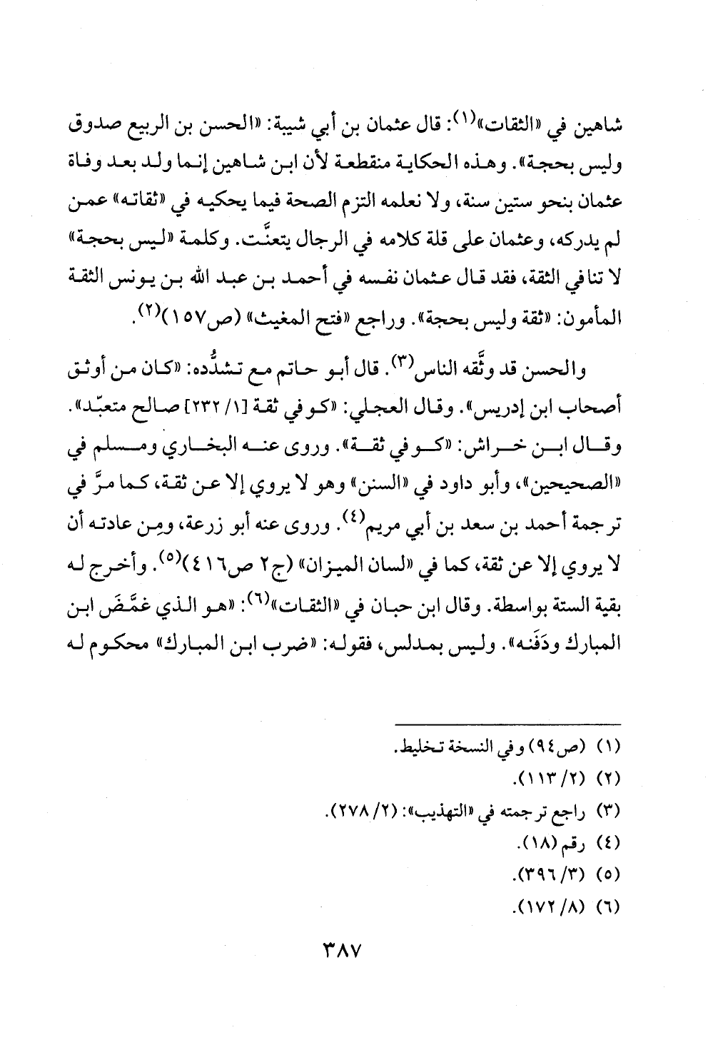 شاهين في «الثقات» (¬١): قال عثمان بن أبي شيبة: «الحسن بن الربيع صدوق وليس بحجة». وهذه الحكاية منقطعة لأن ابن شاهين إنما ولد بعد وفاة عثمان بنحو ستين سنة، ولا نعلمه التزم الصحة فيما يحكيه في «ثقاته» عمن لم يدركه، وعثمان على قلة كلامه في الرجال يتعنَّت. وكلمة «ليس بحجة» لا تنافي الثقة، فقد قال عثمان نفسه في أحمد بن عبد الله بن يونس الثقة المأمون: «ثقة وليس بحجة». وراجع «فتح المغيث» (ص ١٥٧) (¬٢).