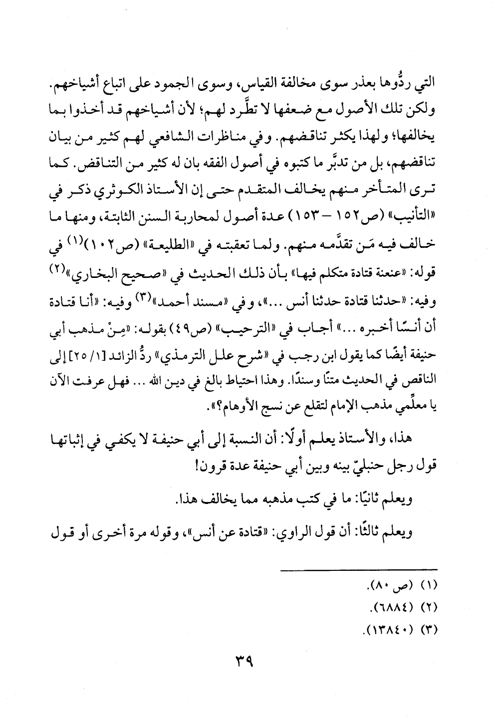 التي ردُّوها بعذر سوى مخالفة القياس، وسوى الجمود على اتباع أشياخهم. ولكن تلك الأصول مع ضعفها لا تطَّرد لهم؛ لأن أشياخهم قد أخذوا بما يخالفها؛ ولهذا يكثر تناقضهم. وفي مناظرات الشافعي لهم كثير من بيان تناقضهم، بل من تدبَّر ما كتبوه في أصول الفقه بان له كثير من التناقض. كما ترى المتأخر منهم يخالف المتقدم حتى إن الأستاذ الكوثري ذكر في "التأنيب" (ص ١٥٢ - ١٥٣) عدة أصول لمحاربة السنن الثابتة، ومنها ما خالف فيه مَن تقدَّمه منهم. ولما تعقبته في "الطليعة" (ص ١٠٢) (¬١) في قوله: "عنعنة قتادة متكلم فيها" بأن ذلك الحديث في "صحيح البخاري" (¬٢) وفيه: "حدثنا قتادة حدثنا أنس ... "، وفي "مسند أحمد" (¬٣) وفيه: "أنا قتادة أن أنسًا أخبره ... " أجاب في "الترحيب" (ص ٤٩) بقوله: "مِنْ مذهب أبي حنيفة أيضًا كما يقول ابن رجب في "شرح علل الترمذي" ردُّ الزائد [١/ ٢٥] إلى الناقص في الحديث متنًا وسندًا. وهذا احتياط بالغ في دين الله ... فهل عرفت الآن يا معلِّمي مذهب الإمام لتقلع عن نسج الأوهام؟ ".