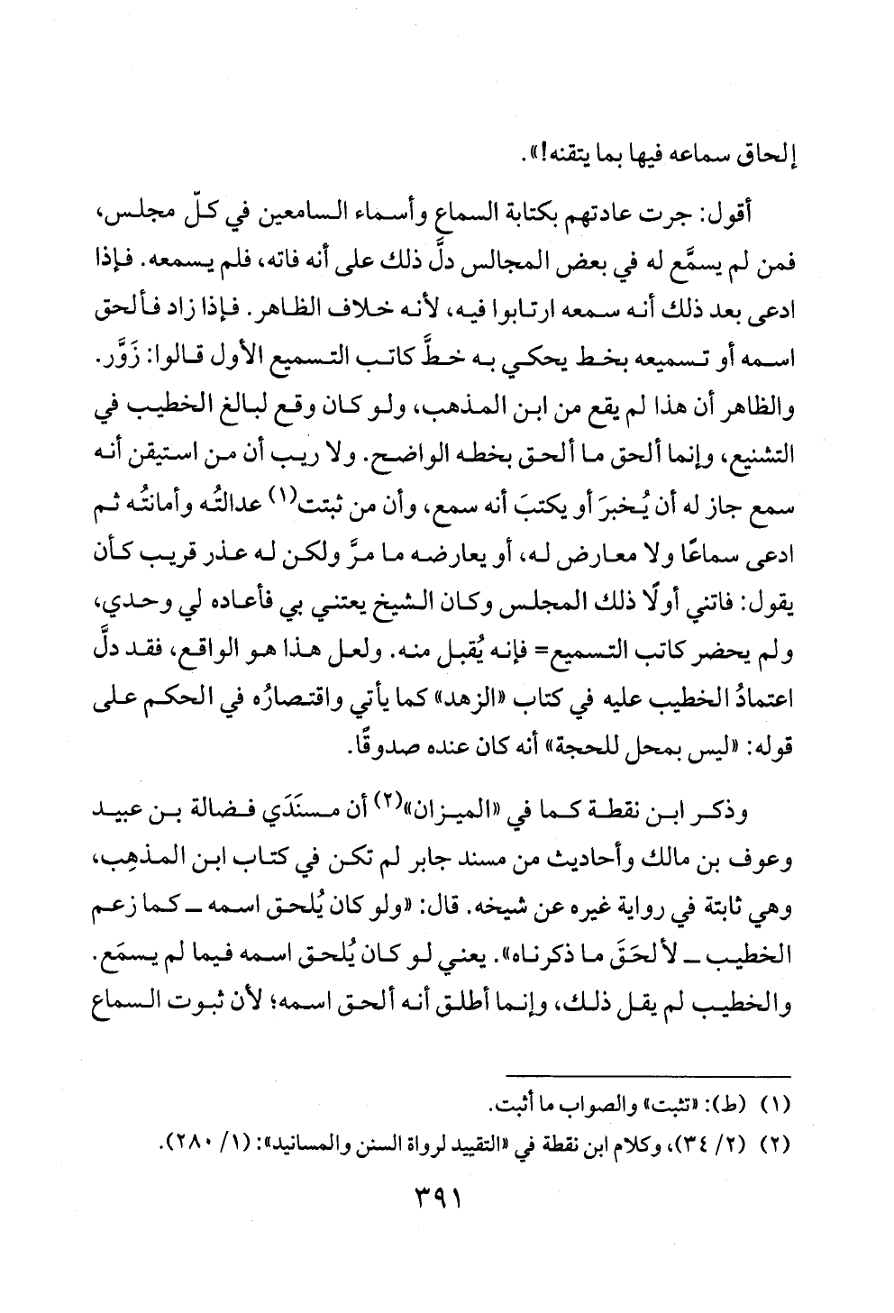 أقول: جرت عادتهم بكتابة السماع وأسماء السامعين في كلّ مجلس، فمن لم يسمَّع له في بعض المجالس دلَّ ذلك على أنه فاته، فلم يسمعه. فإذا ادعى بعد ذلك أنه سمعه ارتابوا فيه، لأنه خلاف الظاهر. فإذا زاد فألحق اسمه أو تسميعه بخط يحكي به خطَّ كاتب التسميع الأول قالوا: زَوَّر. والظاهر أن هذا لم يقع من ابن المذهب، ولو كان وقع لبالغ الخطيب في التشنيع، وإنما ألحق ما ألحق بخطه الواضح. ولا ريب أن من استيقن أنه سمع جاز له أن يُخبرَ أو يكتبَ أنه سمع، وأن من ثبتت (¬١) عدالتُه وأمانتُه ثم ادعى سماعًا ولا معارض له، أو يعارضه ما مرَّ ولكن له عذر قريب كأن يقول: فاتني أولًا ذلك المجلس وكان الشيخ يعتني بي فأعاده لي وحدي، ولم يحضر كاتب التسميع= فإنه يُقبل منه. ولعل هذا هو الواقع، فقد دلَّ اعتمادُ الخطيب عليه في كتاب «الزهد» كما يأتي واقتصارُه في الحكم على قوله: «ليس بمحل للحجة» أنه كان عنده صدوقًا.