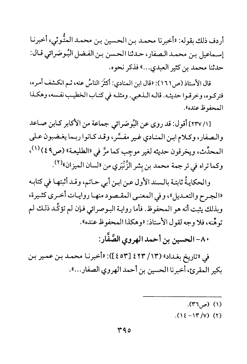 [١/ ٢٣٧] أقول: قد روى عن البُوصَرائي جماعة من الأكابر كابن صاعد والصفار، وكلام ابن المنادي غير مفسَّر، وقد كانوا ربما يغضبون على المحدِّث، ويخرقون حديثه لغير موجِب كما مرَّ في «الطليعة» (ص ٤٩) (¬١)، وكما تراه في ترجمة محمد بن بِشر الزَّنْبَري من «لسان الميزان» (¬٢).