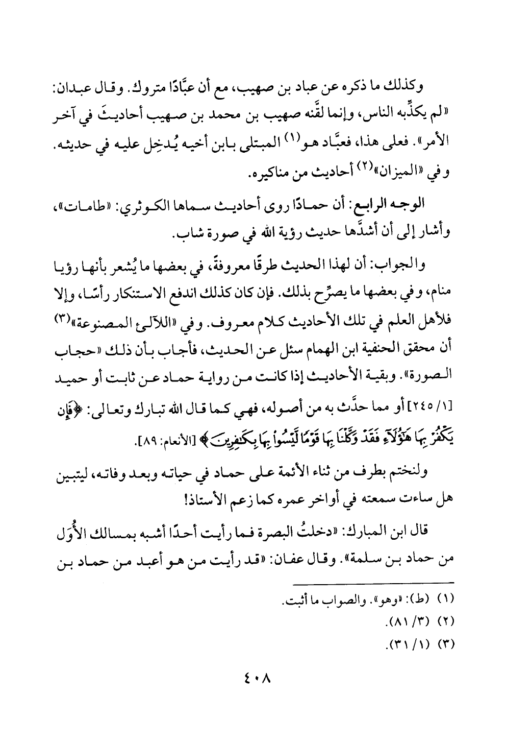 والجواب: أن لهذا الحديث طرقًا معروفةً، في بعضها ما يُشعر بأنها رؤيا منام، وفي بعضها ما يصرِّح بذلك. فإن كان كذلك اندفع الاستنكار رأسًا، وإلا فلأهل العلم في تلك الأحاديث كلام معروف. وفي «اللآلئ المصنوعة» (¬٣) أن محقق الحنفية ابن الهمام سئل عن الحديث، فأجاب بأن ذلك «حجاب الصورة». وبقية الأحاديث إذا كانت من رواية حماد عن ثابت أو حميد [١/ ٢٤٥] أو مما حدَّث به من أصوله، فهي كما قال الله تبارك وتعالى: {فَإِنْ يَكْفُرْ بِهَا هَؤُلَاءِ فَقَدْ وَكَّلْنَا بِهَا قَوْمًا لَيْسُوا بِهَا بِكَافِرِينَ} [الأنعام: (٨٩)].
