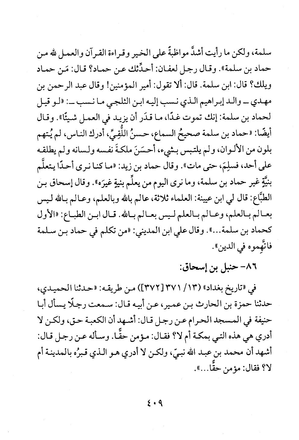 سلمة، ولكن ما رأيت أشدَّ مواظبةً على الخير وقراءة القرآن والعمل لله من حماد بن سلمة». وقال رجل لعفان: أحدِّثك عن حماد؟ قال: مَن حماد ويلك؟ قال: ابن سلمة. قال: ألا تقول: أمير المؤمنين! وقال عبد الرحمن بن مهدي ــ والد إبراهيم الذي نسب إليه ابن الثلجي ما نسب ــ: «لو قيل لحماد بن سلمة: إنك تموت غدًا، ما قدَر أن يزيد في العمل شيئًا». وقال أيضًا: «حماد بن سلمة صحيحُ السماع، حسنُ اللُّقِيِّ، أدرك الناس، لم يُتهم بلون من الألوان، ولم يلتبس بشيء، أحسَنَ ملكةَ نفسه ولسانه ولم يطلقه على أحد، فسلِمَ، حتى مات». وقال حماد بن زيد: «ما كنا نرى أحدًا يتعلَّم بنيَّةٍ غير حماد بن سلمة، وما نرى اليوم من يعلِّم بنيةٍ غيرَه». وقال إسحاق بن الطبَّاع: قال لي ابن عيينة: العلماء ثلاثة، عالم بالله وبالعلم، وعالم بالله ليس بعالم بالعلم، وعالم بالعلم ليس بعالم بالله. قال ابن الطباع: «الأول كحماد بن سلمة ... ». وقال علي ابن المديني: «من تكلم في حماد بن سلمة فاتَّهِموه في الدين».