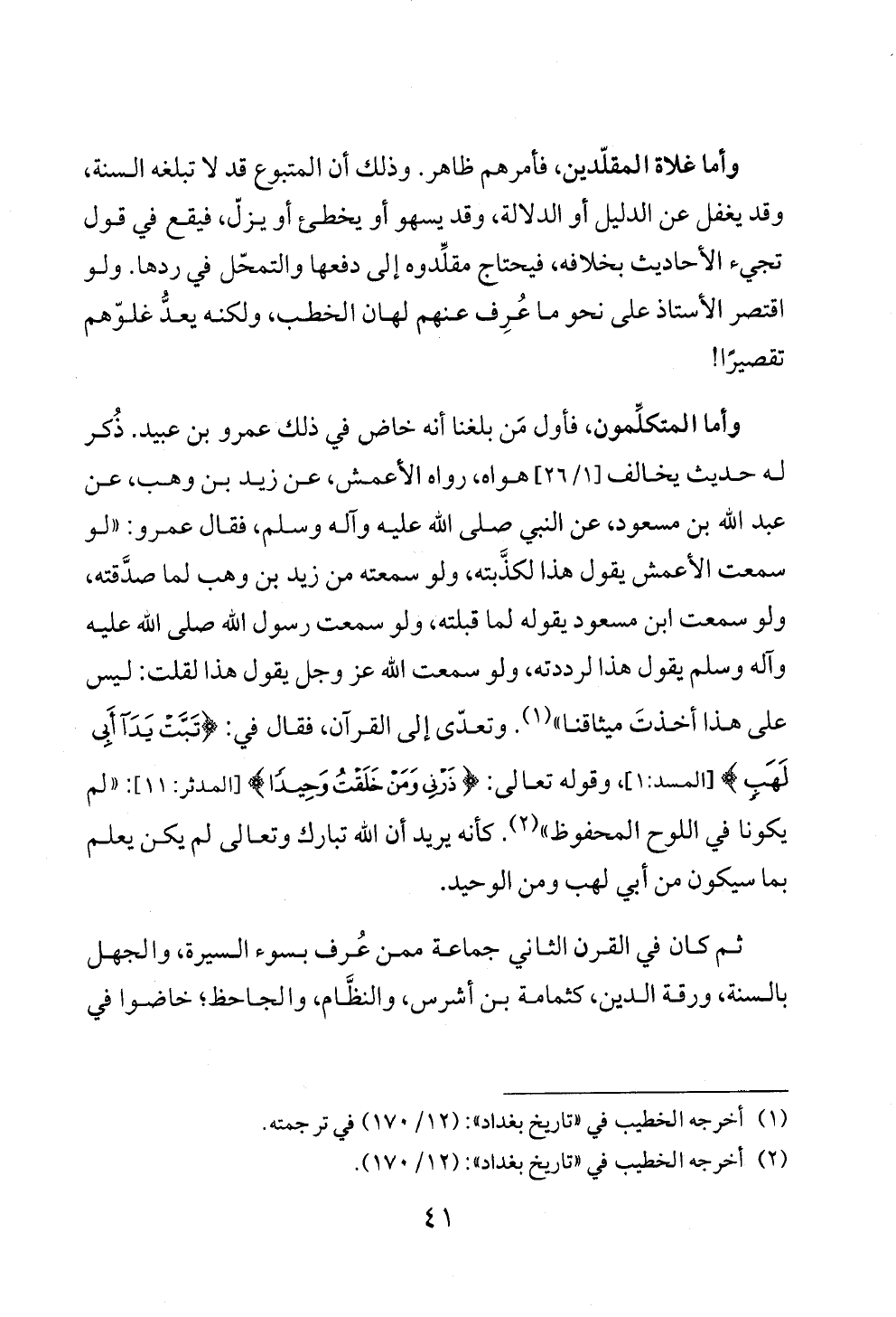 وأما المتكلِّمون، فأول مَن بلغنا أنه خاض في ذلك عمرو بن عبيد. ذُكر له حديث يخالف [١/ ٢٦] هواه، رواه الأعمش، عن زيد بن وهب، عن عبد الله بن مسعود، عن النبي صلى الله عليه وآله وسلم، فقال عمرو: "لو سمعت الأعمش يقول هذا لكذَّبته، ولو سمعته من زيد بن وهب لما صدَّقته، ولو سمعت ابن مسعود يقوله لما قبلته، ولو سمعت رسول الله صلى الله عليه وآله وسلم يقول هذا لرددته، ولو سمعت الله عز وجل يقول هذا لقلت: ليس على هذا أخذتَ ميثاقنا" (¬١). وتعدّى إلى القرآن، فقال في: {تَبَّتْ يَدَا أَبِي لَهَبٍ} [المسد: ١]، وقوله تعالى: {ذَرْنِي وَمَنْ خَلَقْتُ وَحِيدًا} [المدثر: ١١] "لم يكونا في اللوح المحفوظ" (¬٢). كأنه يريد أن الله تبارك وتعالى لم يكن يعلم بما سيكون من أبي لهب ومن الوحيد.