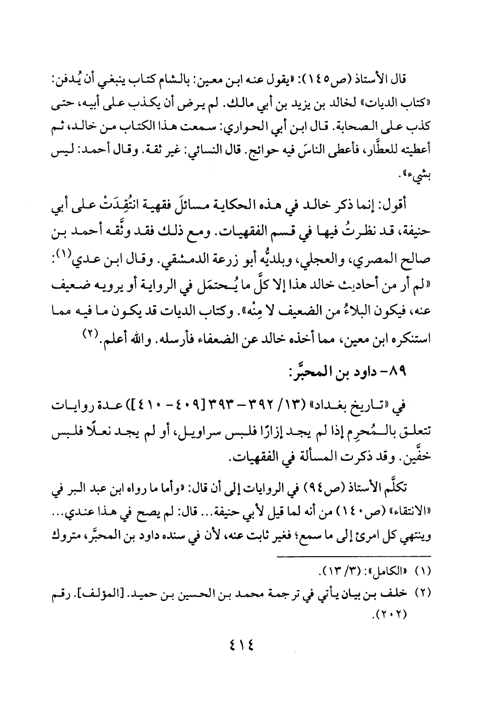 قال الأستاذ (ص ١٤٥): «يقول عنه ابن معين: بالشام كتاب ينبغي أن يُدفن: «كتاب الديات» لخالد بن يزيد بن أبي مالك. لم يرض أن يكذب على أبيه، حتى كذب على الصحابة. قال ابن أبي الحواري: سمعت هذا الكتاب من خالد، ثم أعطيته للعطَّار، فأعطى الناسَ فيه حوائج. قال النسائي: غير ثقة. وقال أحمد: ليس بشيء».