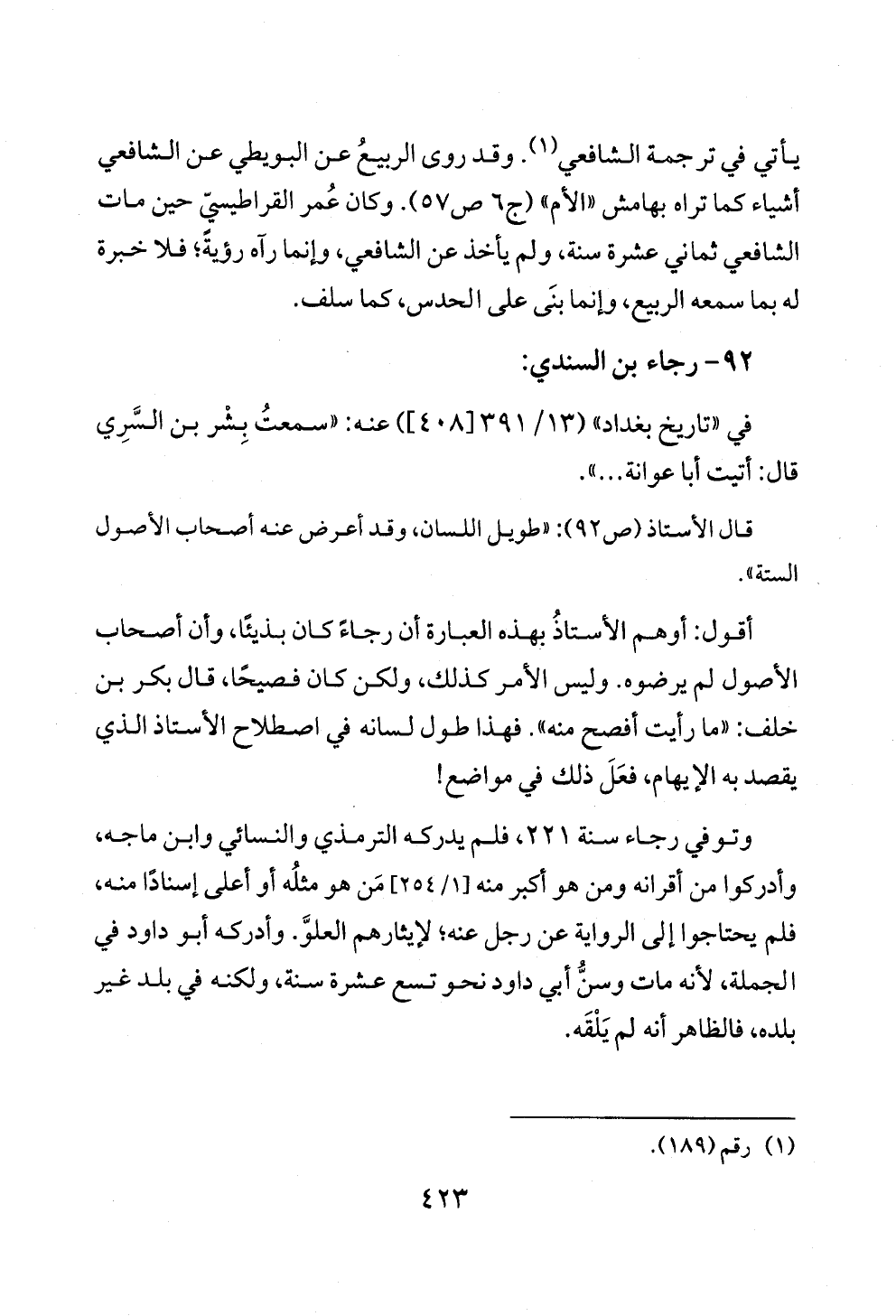 وتوفي رجاء سنة ٢٢١، فلم يدركه الترمذي والنسائي وابن ماجه، وأدركوا من أقرانه ومن هو أكبر منه [١/ ٢٥٤] مَن هو مثلُه أو أعلى إسنادًا منه، فلم يحتاجوا إلى الرواية عن رجل عنه؛ لإيثارهم العلوَّ. وأدركه أبو داود في الجملة، لأنه مات وسنُّ أبي داود نحو تسع عشرة سنة، ولكنه في بلد غير بلده، فالظاهر أنه لم يَلْقَه.