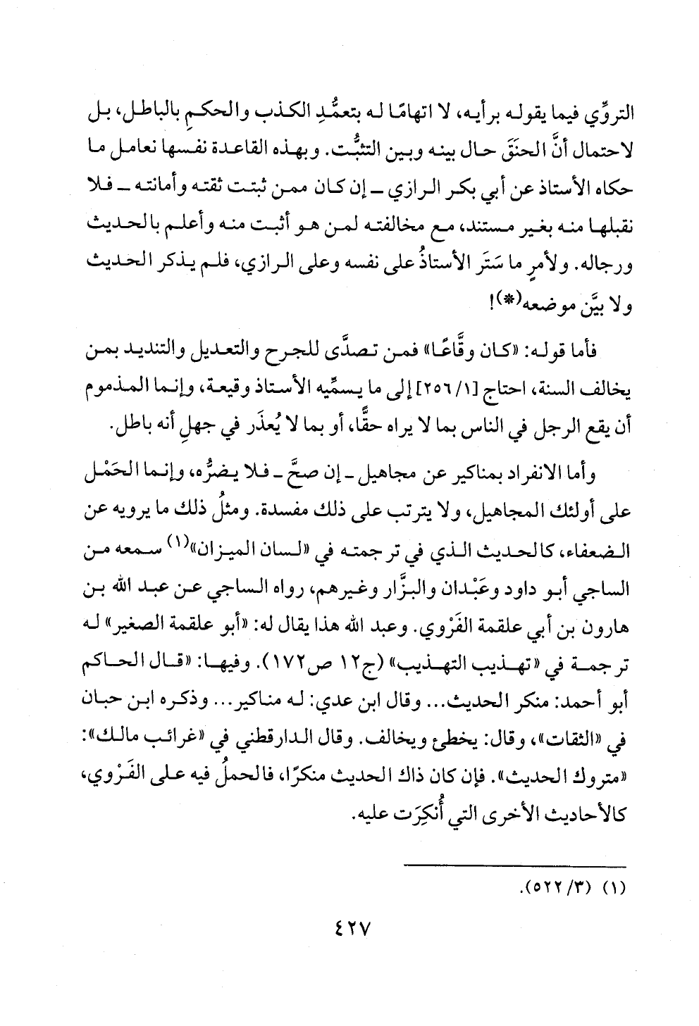 التروِّي فيما يقوله برأيه، لا اتهامًا له بتعمُّدِ الكذب والحكمِ بالباطل، بل لاحتمال أنَّ الحنَقَ حال بينه وبين التثبُّت. وبهذه القاعدة نفسها نعامل ما حكاه الأستاذ عن أبي بكر الرازي ــ إن كان ممن ثبتت ثقته وأمانته ــ فلا نقبلها منه بغير مستند، مع مخالفته لمن هو أثبت منه وأعلم بالحديث ورجاله. ولأمرٍ ما سَتَر الأستاذُ على نفسه وعلى الرازي، فلم يذكر الحديث ولا بيَّن موضعه (*)!