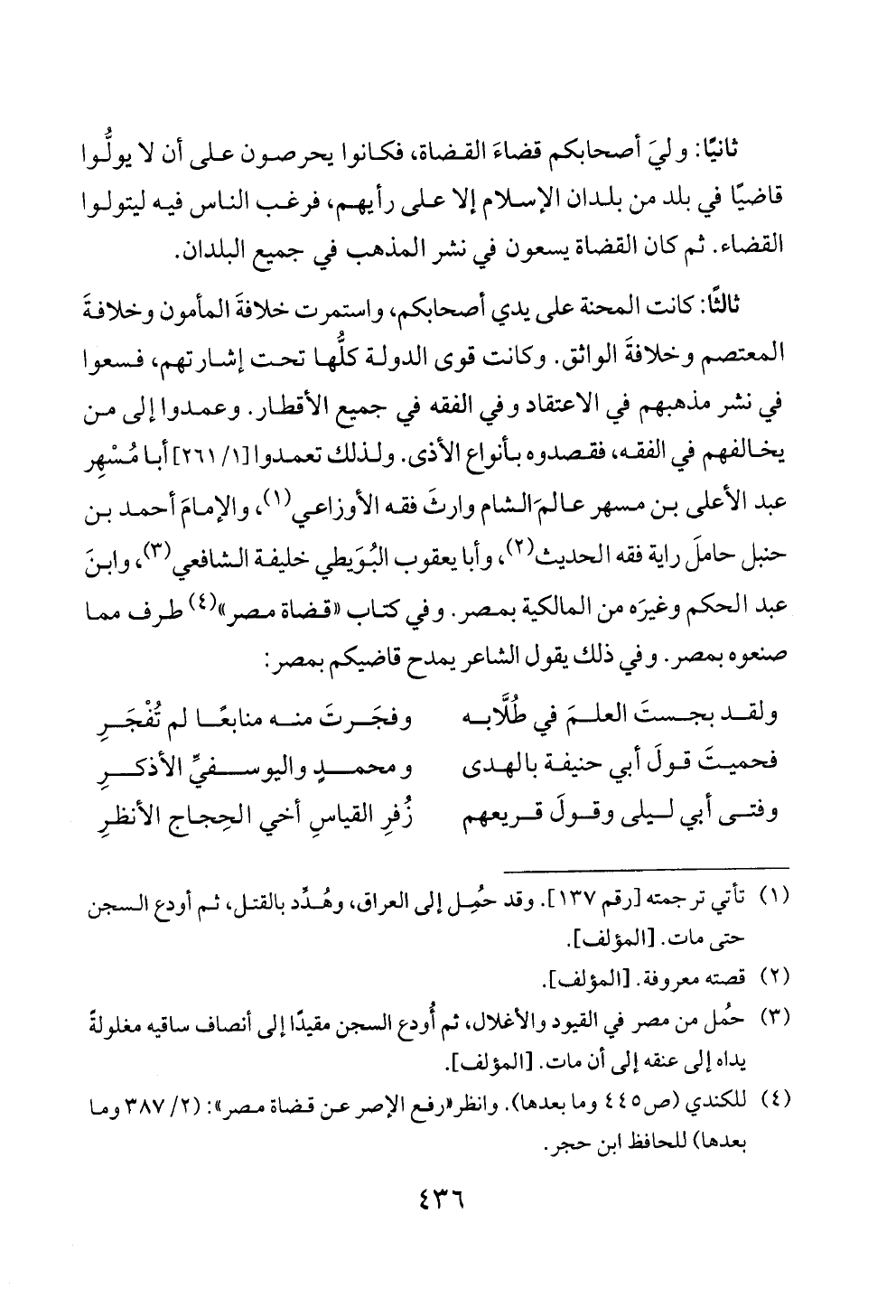 ثالثًا: كانت المحنة على يدي أصحابكم، واستمرت خلافةَ المأمون وخلافةَ المعتصم وخلافةَ الواثق. وكانت قوى الدولة كلُّها تحت إشارتهم، فسعوا في نشر مذهبهم في الاعتقاد وفي الفقه في جميع الأقطار. وعمدوا إلى من يخالفهم في الفقه، فقصدوه بأنواع الأذى. ولذلك تعمدوا [١/ ٢٦١] أبا مُسْهِر عبد الأعلى بن مسهر عالمَ الشام وارثَ فقه الأوزاعي (¬١)، والإمامَ أحمد بن حنبل حاملَ راية فقه الحديث (¬٢)، وأبا يعقوب البُوَيطي خليفة الشافعي (¬٣)، وابنَ عبد الحكم وغيرَه من المالكية بمصر. وفي كتاب «قضاة مصر» (¬٤) طرف مما صنعوه بمصر. وفي ذلك يقول الشاعر يمدح قاضيكم بمصر: