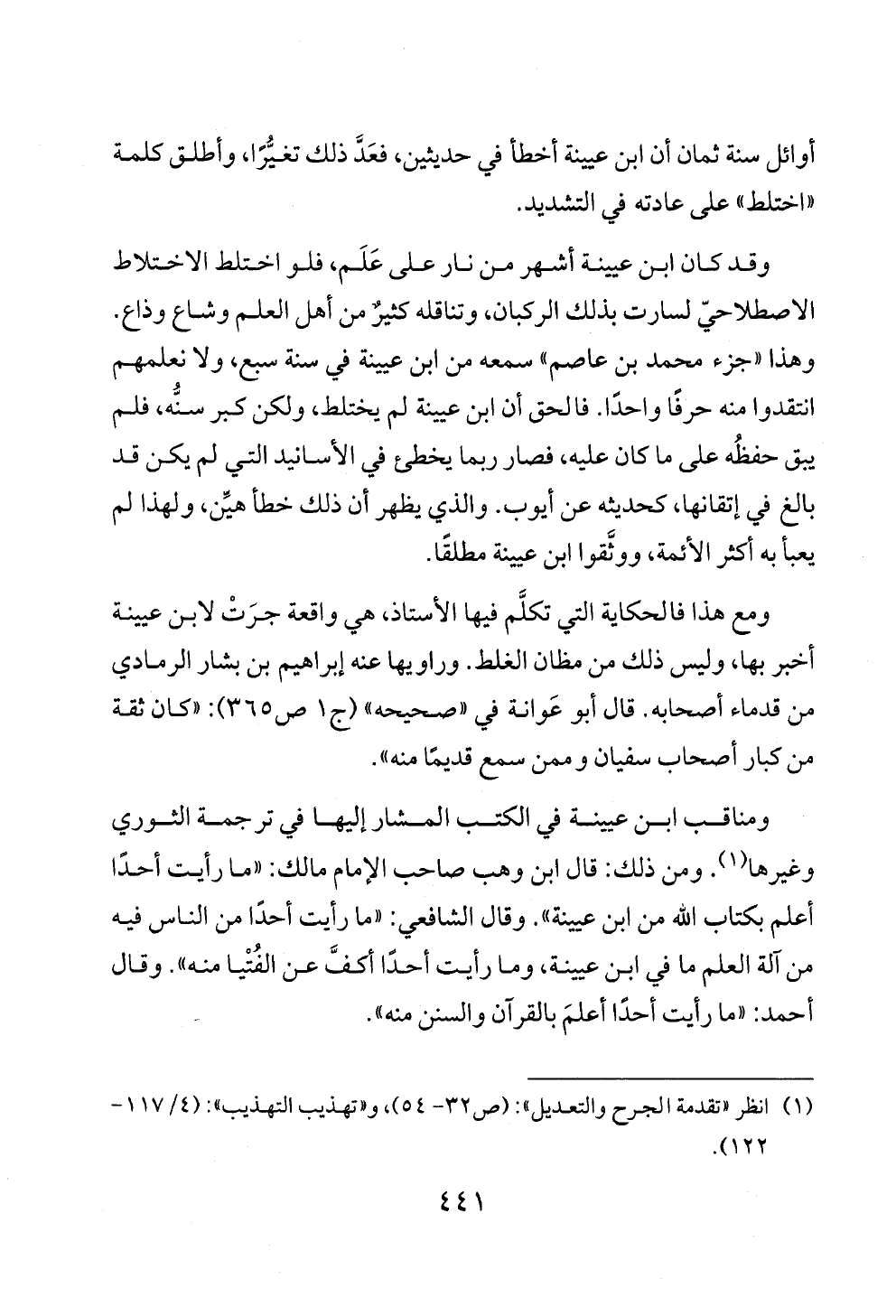 ومع هذا فالحكاية التي تكلَّم فيها الأستاذ، هي واقعة جرَتْ لابن عيينة أخبر بها، وليس ذلك من مظان الغلط. وراويها عنه إبراهيم بن بشار الرمادي من قدماء أصحابه. قال أبو عَوانة في «صحيحه» (ج ١ ص ٣٦٥): «كان ثقة من كبار أصحاب سفيان وممن سمع قديمًا منه».