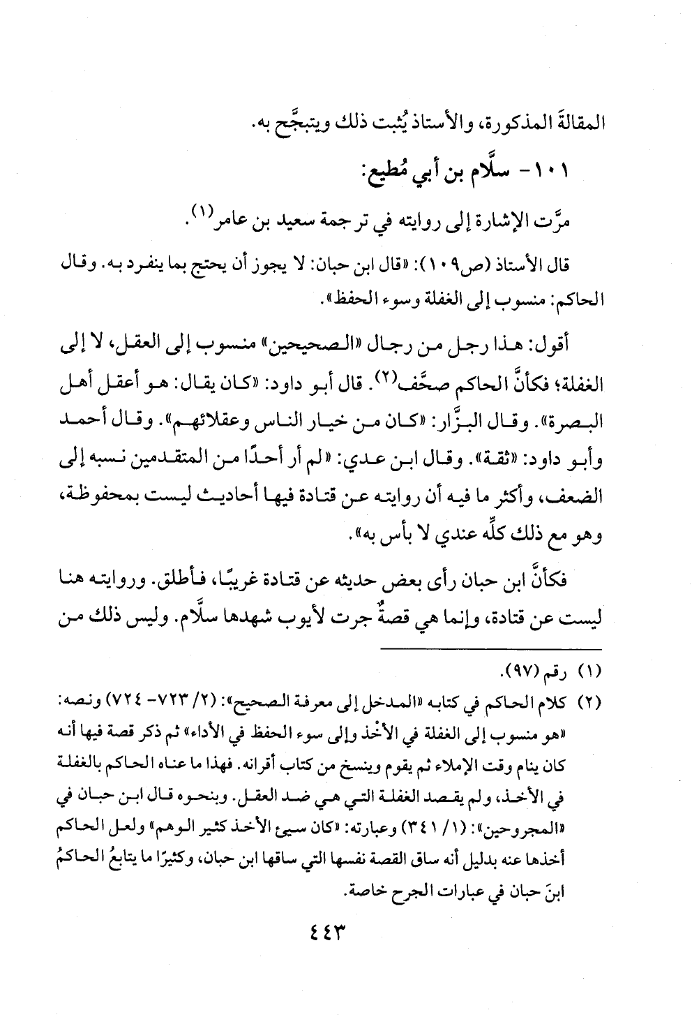 قال الأستاذ (ص ١٠٩): «قال ابن حبان: لا يجوز أن يحتج بما ينفرد به. وقال الحاكم: منسوب إلى الغفلة وسوء الحفظ».