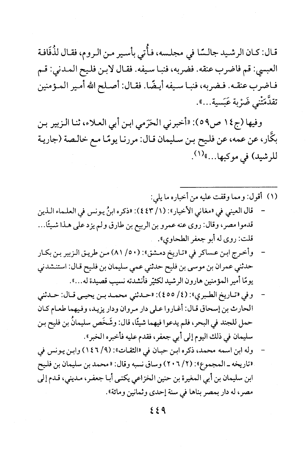 وفيها (ج ١٤ ص ٥٩): «أخبرني الحَرَمي ابن أبي العلاء، ثنا الزبير بن بكَّار، عن عمه، عن فليح بن سليمان قال: مررنا يومًا مع خالصة (جارية للرشيد) في موكبها ... » (¬١).