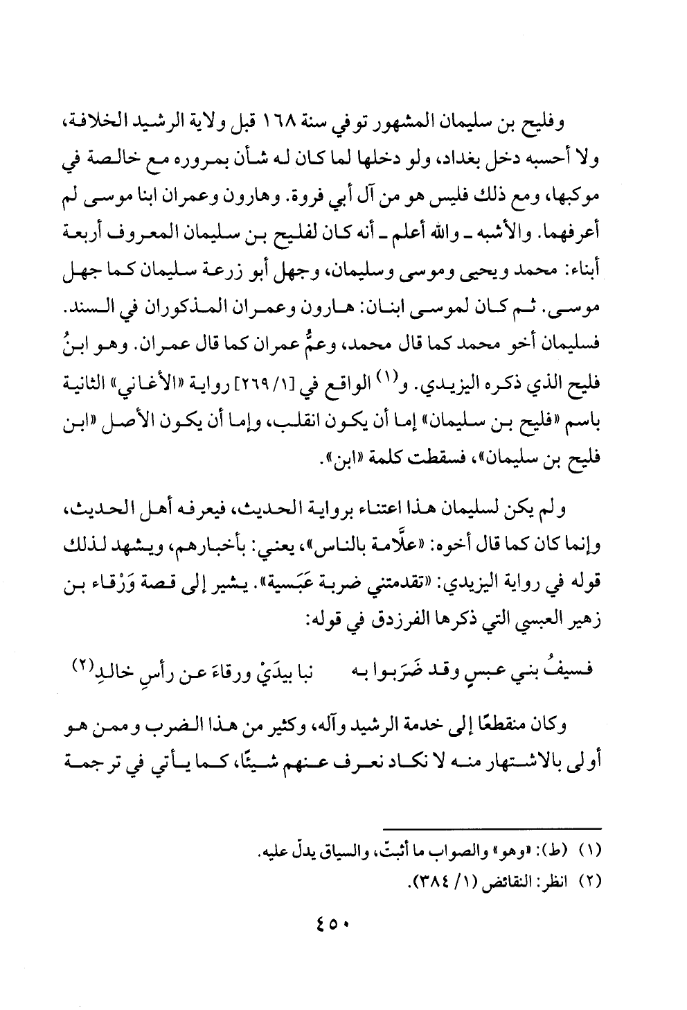 وفليح بن سليمان المشهور توفي سنة ١٦٨ قبل ولاية الرشيد الخلافة، ولا أحسبه دخل بغداد، ولو دخلها لما كان له شأن بمروره مع خالصة في موكبها، ومع ذلك فليس هو من آل أبي فروة. وهارون وعمران ابنا موسى لم أعرفهما. والأشبه ــ والله أعلم ــ أنه كان لفليح بن سليمان المعروف أربعة أبناء: محمد ويحيى وموسى وسليمان، وجهل أبو زرعة سليمان كما جهل موسى. ثم كان لموسى ابنان: هارون وعمران المذكوران في السند. فسليمان أخو محمد كما قال محمد، وعمُّ عمران كما قال عمران. وهو ابنُ فليح الذي ذكره اليزيدي. و (¬١) الواقع في [١/ ٢٦٩] رواية «الأغاني» الثانية باسم «فليح بن سليمان» إما أن يكون انقلب، وإما أن يكون الأصل «ابن فليح بن سليمان»، فسقطت كلمة «ابن».