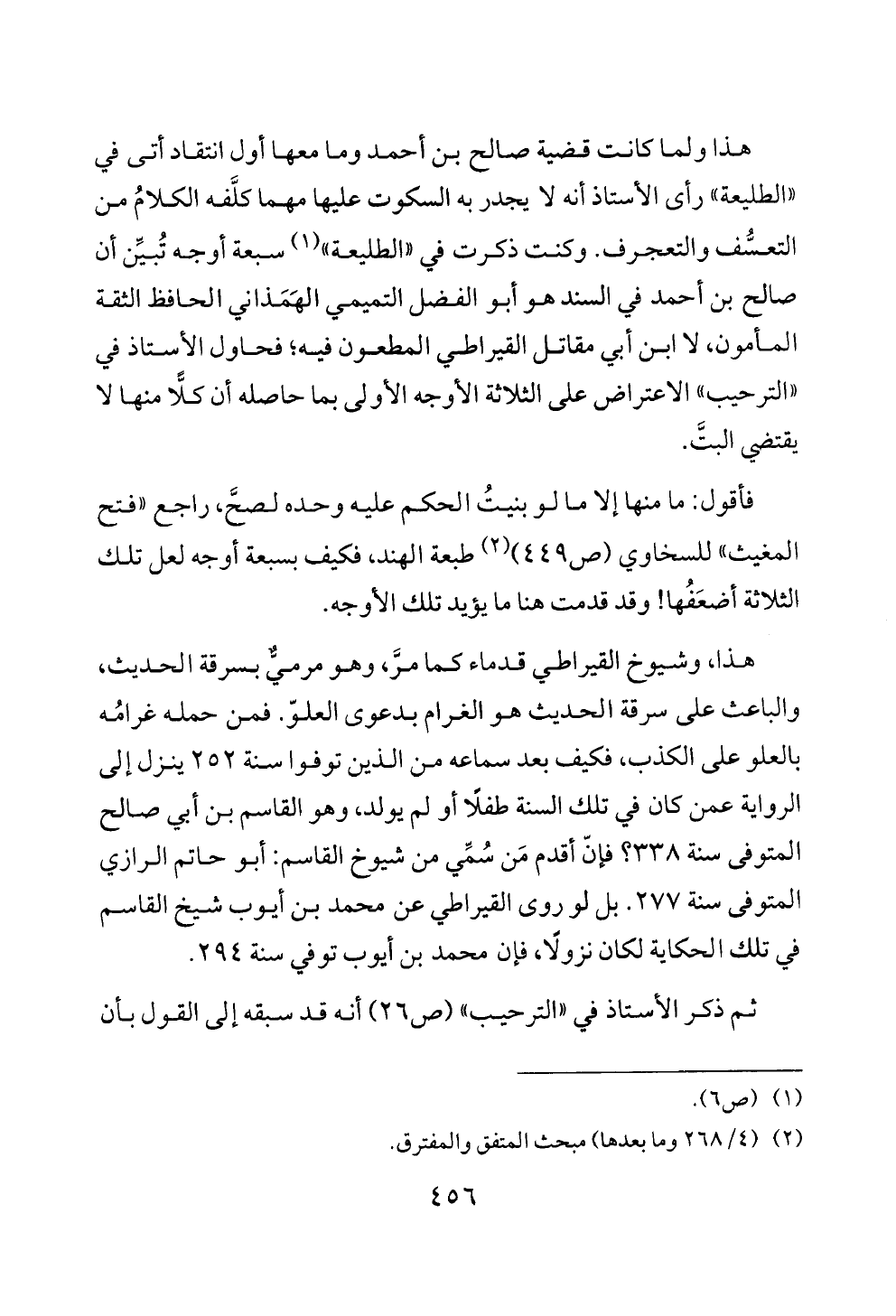 هذا ولما كانت قضية صالح بن أحمد وما معها أول انتقاد أتى في «الطليعة» رأى الأستاذ أنه لا يجدر به السكوت عليها مهما كلَّفه الكلامُ من التعسُّف والتعجرف. وكنت ذكرت في «الطليعة» (¬١) سبعة أوجه تُبيِّن أن صالح بن أحمد في السند هو أبو الفضل التميمي الهَمَذاني الحافظ الثقة المأمون، لا ابن أبي مقاتل القيراطي المطعون فيه؛ فحاول الأستاذ في «الترحيب» الاعتراض على الثلاثة الأوجه الأولى بما حاصله أن كلًّا منها لا يقتضي البتَّ.