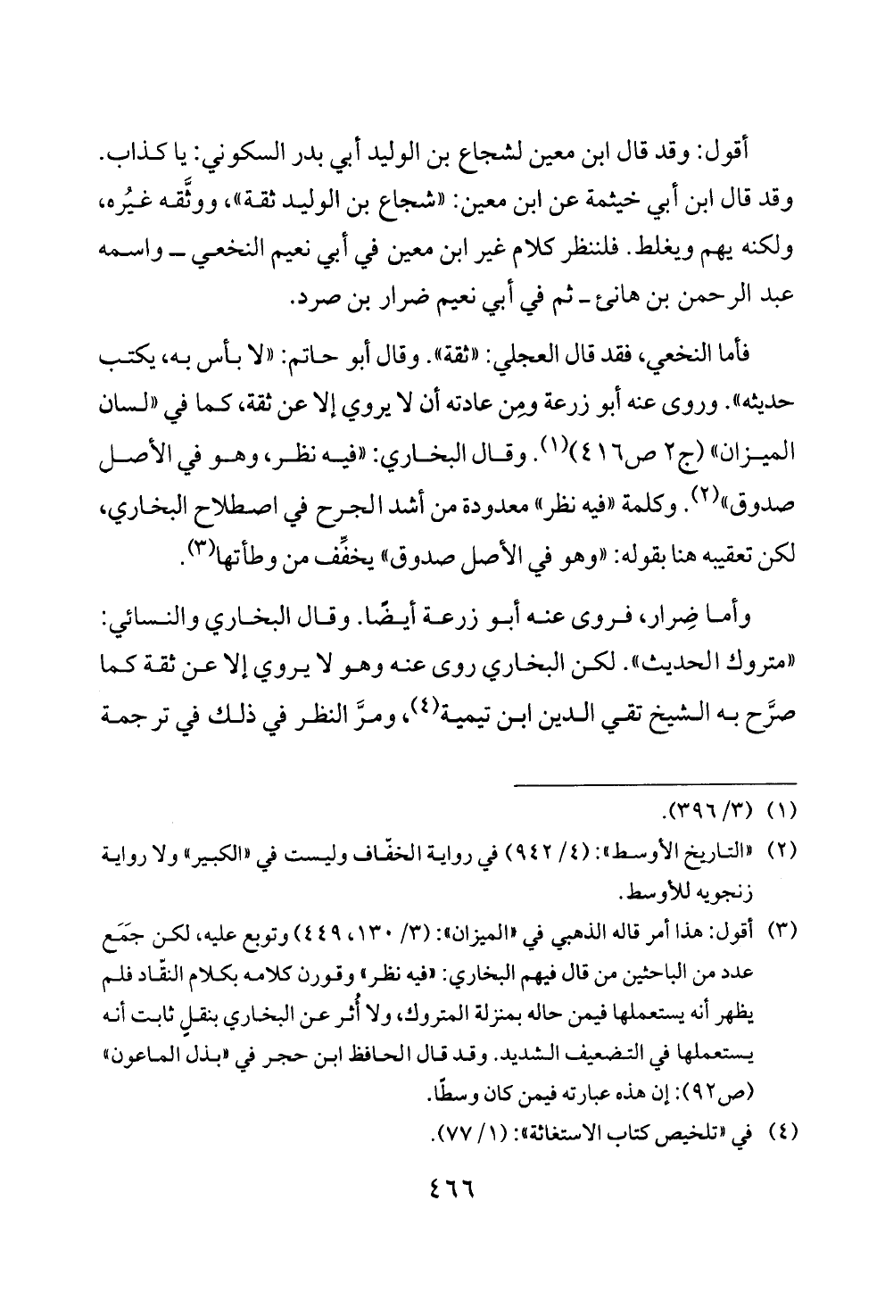 أقول: وقد قال ابن معين لشجاع بن الوليد أبي بدر السكوني: يا كذاب. وقد قال ابن أبي خيثمة عن ابن معين: «شجاع بن الوليد ثقة»، ووثَّقه غيُره، ولكنه يهم ويغلط. فلننظر كلام غير ابن معين في أبي نعيم النخعي ــ واسمه عبد الرحمن بن هانئ ــ ثم في أبي نعيم ضرار بن صرد.