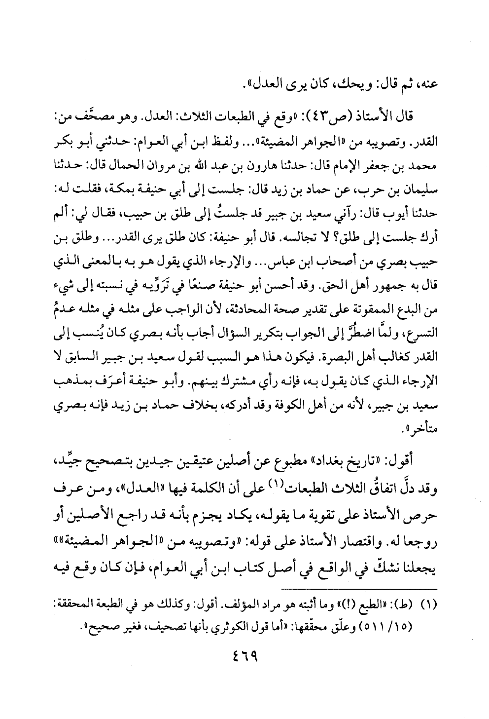 قال الأستاذ (ص ٤٣): «وقع في الطبعات الثلاث: العدل. وهو مصحَّف من: القدر. وتصويبه من «الجواهر المضيئة» ... ولفظ ابن أبي العوام: حدثني أبو بكر محمد بن جعفر الإمام قال: حدثنا هارون بن عبد الله بن مروان الحمال قال: حدثنا سليمان بن حرب، عن حماد بن زيد قال: جلست إلى أبي حنيفة بمكة، فقلت له: حدثنا أيوب قال: رآني سعيد بن جبير قد جلستُ إلى طلق بن حبيب، فقال لي: ألم أرك جلست إلى طلق؟ لا تجالسه. قال أبو حنيفة: كان طلق يرى القدر ... وطلق بن حبيب بصري من أصحاب ابن عباس ... والإرجاء الذي يقول هو به بالمعنى الذي قال به جمهور أهل الحق. وقد أحسن أبو حنيفة صنعًا في تَرَوِّيه في نسبته إلى شيء من البدع الممقوتة على تقدير صحة المحادثة، لأن الواجب على مثله في مثله عدمُ التسرع، ولمَّا اضطُرَّ إلى الجواب بتكرير السؤال أجاب بأنه بصري كان يُنسب إلى القدر كغالب أهل البصرة. فيكون هذا هو السبب لقول سعيد بن جبير السابق لا الإرجاء الذي كان يقول به، فإنه رأي مشترك بينهم. وأبو حنيفة أعرَف بمذهب سعيد بن جبير، لأنه من أهل الكوفة وقد أدركه، بخلاف حماد بن زيد فإنه بصري متأخر».