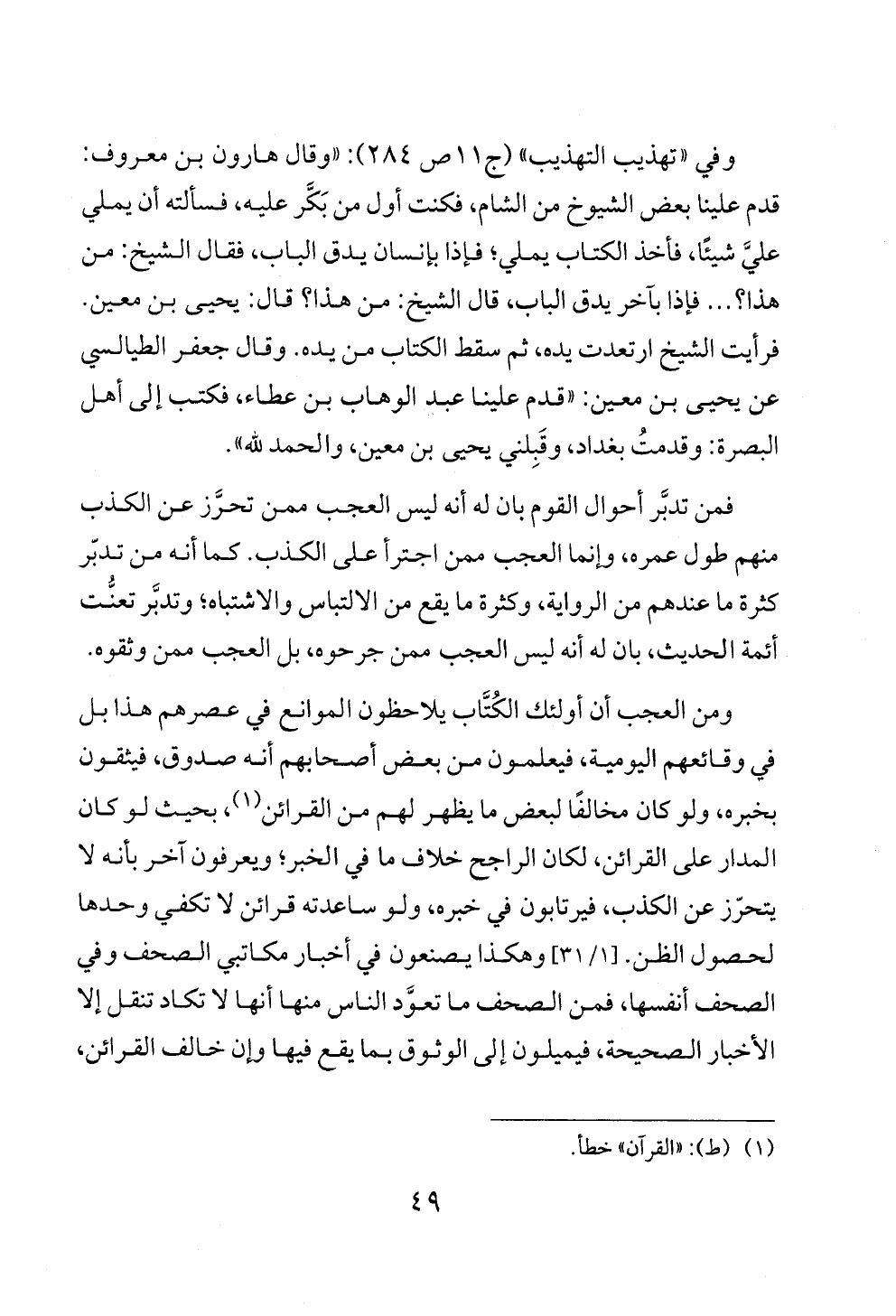 فمن تدبَّر أحوال القوم بان له أنه ليس العجب ممن تحرَّز عن الكذب منهم طول عمره، وإنما العجب ممن اجترأ على الكذب. كما أنه من تدبّر كثرة ما عندهم من الرواية، وكثرة ما يقع من الالتباس والاشتباه؛ وتدبَّر تعنُّت أئمة الحديث، بان له أنه ليس العجب ممن جرحوه، بل العجب ممن وثقوه.