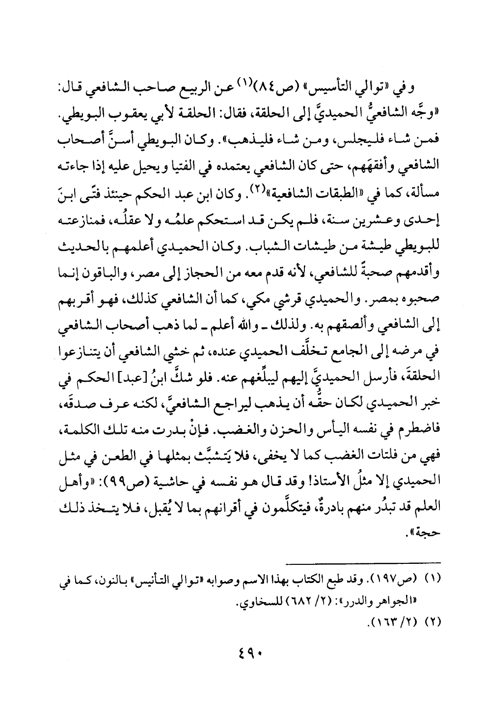 وفي «توالي التأسيس» (ص ٨٤) (¬١) عن الربيع صاحب الشافعي قال: «وجَّه الشافعيُّ الحميديَّ إلى الحلقة، فقال: الحلقة لأبي يعقوب البويطي. فمن شاء فليجلس، ومن شاء فليذهب». وكان البويطي أسنَّ أصحاب الشافعي وأفقهَهم، حتى كان الشافعي يعتمده في الفتيا ويحيل عليه إذا جاءته مسألة، كما في «الطبقات الشافعية» (¬٢). وكان ابن عبد الحكم حينئذ فتًى ابنَ إحدى وعشرين سنة، فلم يكن قد استحكم علمُه ولا عقلُه، فمنازعته للبويطي طيشة من طيشات الشباب. وكان الحميدي أعلمهم بالحديث وأقدمهم صحبةً للشافعي، لأنه قدم معه من الحجاز إلى مصر، والباقون إنما صحبوه بمصر. والحميدي قرشي مكي، كما أن الشافعي كذلك، فهو أقربهم إلى الشافعي وألصقهم به. ولذلك ــ والله أعلم ــ لما ذهب أصحاب الشافعي في مرضه إلى الجامع تخلَّف الحميدي عنده، ثم خشي الشافعي أن يتنازعوا الحلقةَ، فأرسل الحميديَّ إليهم ليبلِّغهم عنه. فلو شكَّ ابنُ [عبد] الحكم في خبر الحميدي لكان حقُّه أن يذهب ليراجع الشافعيَّ، لكنه عرف صدقَه، فاضطرم في نفسه اليأس والحزن والغضب. فإنْ بدرت منه تلك الكلمة، فهي من فلتات الغضب كما لا يخفى، فلا يَتشبَّث بمثلها في الطعن في مثل الحميدي إلا مثلُ الأستاذ! وقد قال هو نفسه في حاشية (ص ٩٩): «وأهل العلم قد تبدُر منهم بادرةٌ، فيتكلَّمون في أقرانهم بما لا يُقبل، فلا يتخذ ذلك حجة».