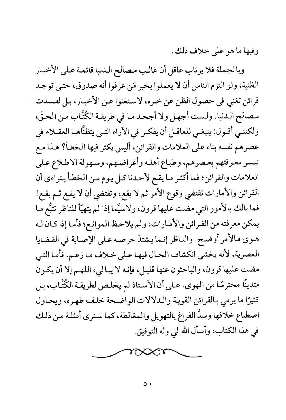 وبالجملة فلا يرتاب عاقل أن غالب مصالح الدنيا قائمة على الأخبار الظنية، ولو التزم الناس أن لا يعملوا بخبر مَن عرفوا أنه صدوق، حتى توجد قرائن تغني في حصول الظن عن خبره، لاستغنوا عن الأخبار، بل لفسدت مصالح الدنيا. ولست أجهل ولا أجحد ما في طريقة الكُتَّاب من الحقّ، ولكنني أقول: ينبغي للعاقل أن يفكر في الآراء التي يتظنَّاها العقلاء في عصرهم نفسه بناء على العلامات والقرائن، أليس يكثر فيها الخطأ؟ هذا مع تيسر معرفتهم بعصرهم، وطباع أهله وأغراضهم، وسهولة الاطلاع على العلامات والقرائن؛ فما أكثر ما يقع لأحدنا كل يوم من الخطأ يتراءى أن القرائن والأمارات تقتضي وقوع الأمر ثم لا يقع، وتقتضي أن لا يقع ثم يقع! فما بالك بالأمور التي مضت عليها قرون، ولاسيَّما إذا لم يتهيّأ للناظر تتبُّع ما يمكن معرفته من القرائن والأمارات، ولم يلاحظ الموانع؛ فأما إذا كان له هوى فالأمر أوضح. والناظر إنما يشتدّ حرصه على الإصابة في القضايا العصرية، لأنه يخشى انكشاف الحال فيها على خلاف ما زعم. فأما التي مضت عليها قرون، والباحثون عنها قليل، فإنه لا يبالي، اللهم إلا أن يكون متدينًا محترسًا من الهوى. على أن الأستاذ لم يخلص لطريقة الكُتَّاب، بل كثيرًا ما يرمي بالقرائن القوية والدلالات الواضحة خلف ظهره، ويحاول اصطناع خلافها وسدَّ الفراغ بالتهويل والمغالطة، كما سترى أمثلة من ذلك في هذا الكتاب، وأسأل الله لي وله التوفيق.
