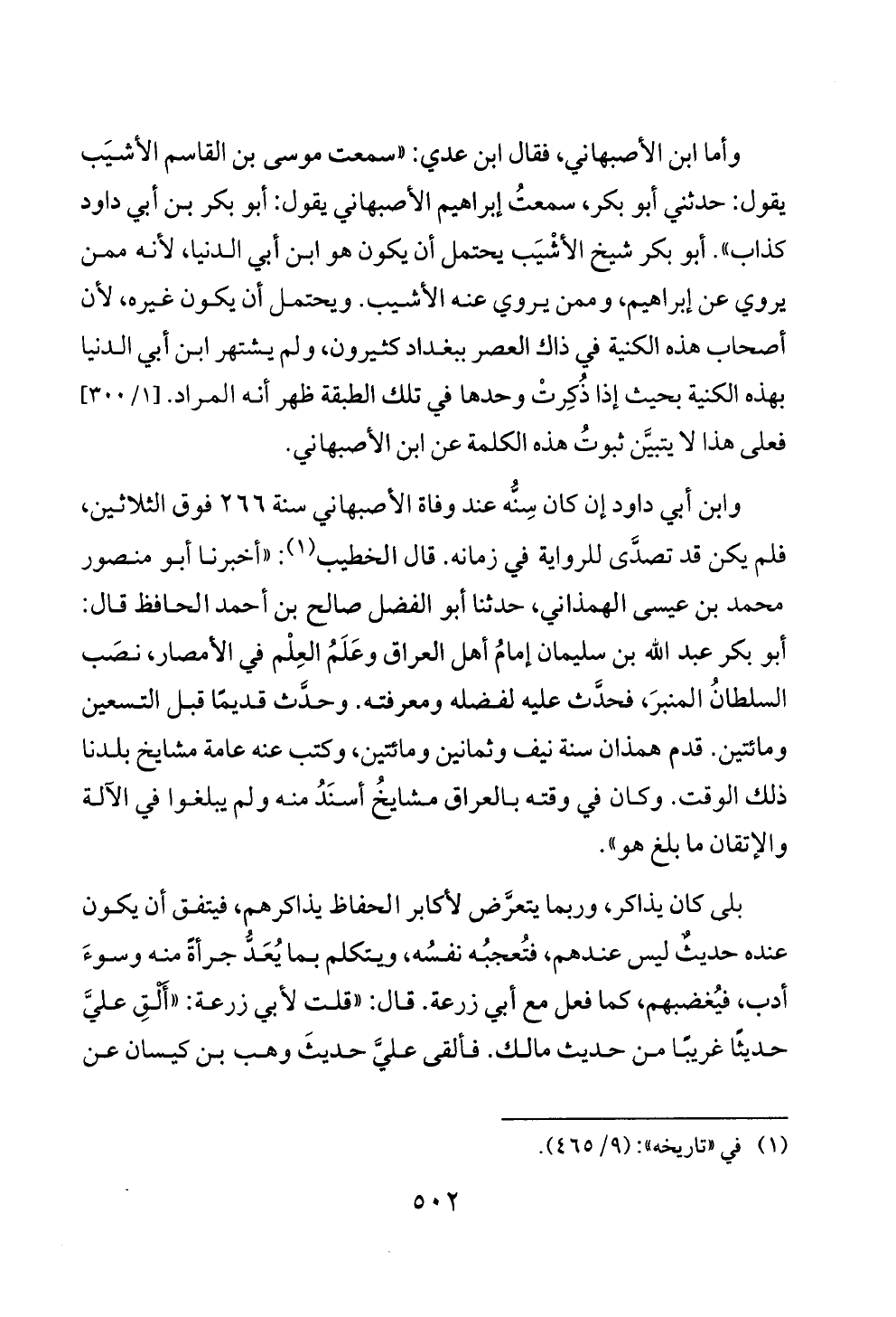 وأما ابن الأصبهاني، فقال ابن عدي: «سمعت موسى بن القاسم الأشيَب يقول: حدثني أبو بكر، سمعتُ إبراهيم الأصبهاني يقول: أبو بكر بن أبي داود كذاب». أبو بكر شيخ الأشْيَب يحتمل أن يكون هو ابن أبي الدنيا، لأنه ممن يروي عن إبراهيم، وممن يروي عنه الأشيب. ويحتمل أن يكون غيره، لأن أصحاب هذه الكنية في ذاك العصر ببغداد كثيرون، ولم يشتهر ابن أبي الدنيا بهذه الكنية بحيث إذا ذُكِرتْ وحدها في تلك الطبقة ظهر أنه المراد. [١/ ٣٠٠] فعلى هذا لا يتبيَّن ثبوتُ هذه الكلمة عن ابن الأصبهاني.