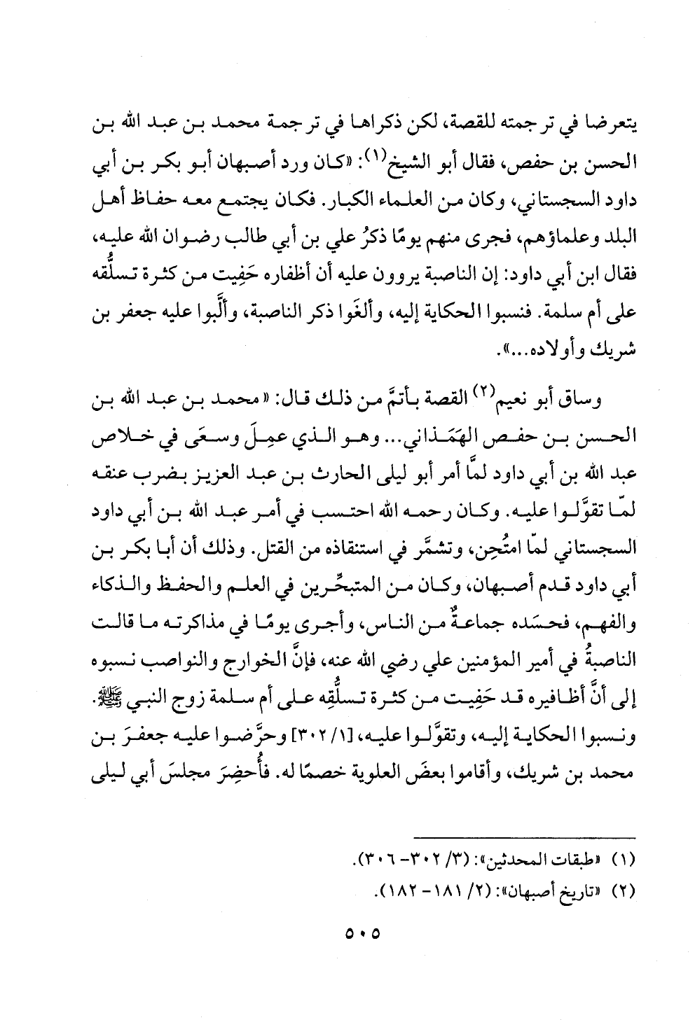 وساق أبو نعيم (¬٢) القصة بأتمَّ من ذلك قال: «محمد بن عبد الله بن الحسن بن حفص الهَمَذاني ... وهو الذي عمِلَ وسعَى في خلاص عبد الله بن أبي داود لمَّا أمر أبو ليلى الحارث بن عبد العزيز بضرب عنقه لمّا تقوَّلوا عليه. وكان رحمه الله احتسب في أمر عبد الله بن أبي داود السجستاني لمّا امتُحِن، وتشمَّر في استنقاذه من القتل. وذلك أن أبا بكر بن أبي داود قدم أصبهان، وكان من المتبحِّرين في العلم والحفظ والذكاء والفهم، فحسَده جماعةٌ من الناس، وأجرى يومًا في مذاكرته ما قالت الناصبةُ في أمير المؤمنين علي رضي الله عنه، فإنَّ الخوارج والنواصب نسبوه إلى أنَّ أظافيره قد حَفِيت من كثرة تسلُّقِه على أم سلمة زوج النبي - صلى الله عليه وسلم -. ونسبوا الحكاية إليه، وتقوَّلوا عليه، [١/ ٣٠٢] وحرَّضوا عليه جعفرَ بن محمد بن شريك، وأقاموا بعضَ العلوية خصمًا له. فأُحضِرَ مجلسَ أبي ليلى