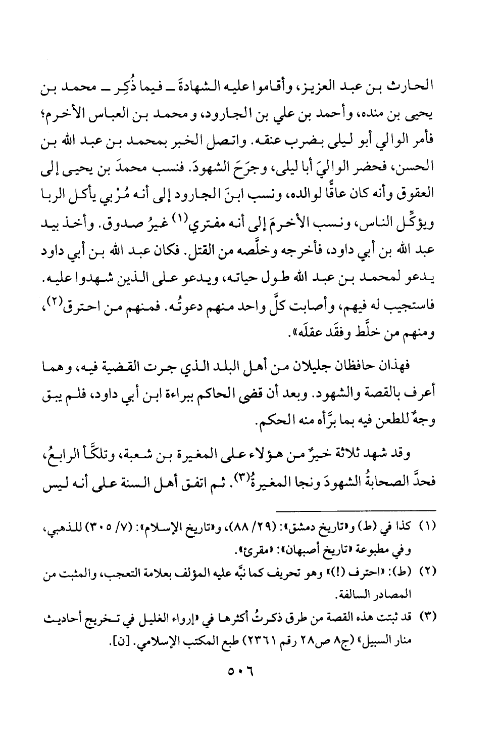 الحارث بن عبد العزيز، وأقاموا عليه الشهادةَ ــ فيما ذُكِر ــ محمد بن يحيى بن منده، وأحمد بن علي بن الجارود، ومحمد بن العباس الأخرم؛ فأمر الوالي أبو ليلى بضرب عنقه. واتصل الخبر بمحمد بن عبد الله بن الحسن، فحضر الواليَ أبا ليلى، وجرَحَ الشهودَ. فنسب محمدَ بن يحيى إلى العقوق وأنه كان عاقًّا لوالده، ونسب ابنَ الجارود إلى أنه مُرْبي يأكل الربا ويؤكِّل الناس، ونسب الأخرمَ إلى أنه مفتري (¬١) غيرُ صدوق. وأخذ بيد عبد الله بن أبي داود، فأخرجه وخلَّصه من القتل. فكان عبد الله بن أبي داود يدعو لمحمد بن عبد الله طول حياته، ويدعو على الذين شهدوا عليه. فاستجيب له فيهم، وأصابت كلَّ واحد منهم دعوتُه. فمنهم من احترق (¬٢)، ومنهم من خلَّط وفقَد عقلَه».