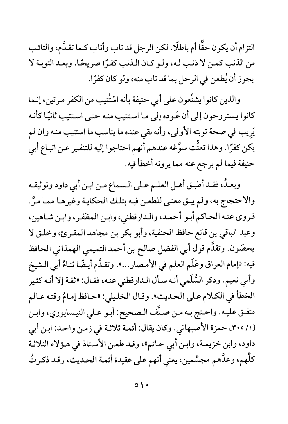 وبعدُ، فقد أطبق أهل العلم على السماع من ابن أبي داود وتوثيقه والاحتجاج به، ولم يبق معنى للطعن فيه بتلك الحكاية وغيرها مما مرَّ. فروى عنه الحاكم أبو أحمد، والدارقطني، وابن المظفر، وابن شاهين، وعبد الباقي بن قانع حافظ الحنفية، وأبو بكر بن مجاهد المقرئ، وخلق لا يحصَون. وتقدَّم قول أبي الفضل صالح بن أحمد التميمي الهمذاني الحافظ فيه: «إمام العراق وعَلَم العلم في الأمصار ... ». وتقدَّم أيضًا ثناءُ أبي الشيخ وأبي نعيم. وذكر السُّلَمي أنه سأل الدارقطني عنه، فقال: «ثقة إلا أنه كثير الخطأ في الكلام على الحديث». وقال الخليلي: «حافظ إمامُ وقته عالم متفق عليه. واحتج به من صنَّف الصحيح: أبو علي النيسابوري، وابن [١/ ٣٠٥] حمزة الأصبهاني. وكان يقال: أئمة ثلاثة في زمن واحد: ابن أبي داود، وابن خزيمة، وابن أبي حاتم»، وقد طعن الأستاذ في هؤلاء الثلاثة كلِّهم، وعدَّهم مجسِّمين، يعني أنهم على عقيدة أئمة الحديث، وقد ذكرتُ