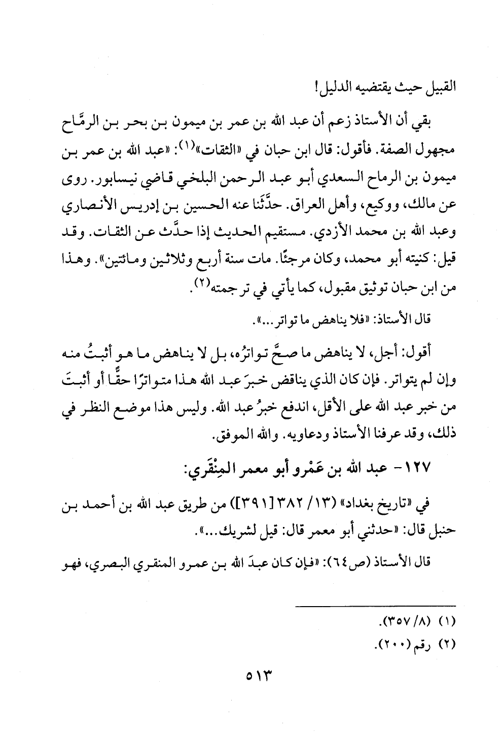أقول: أجل، لا يناهض ما صحَّ تواترُه، بل لا يناهض ما هو أثبتُ منه وإن لم يتواتر. فإن كان الذي يناقض خبرَ عبد الله هذا متواترًا حقًّا أو أثبتَ من خبر عبد الله على الأقل، اندفع خبرُ عبد الله. وليس هذا موضع النظر في ذلك، وقد عرفنا الأستاذ ودعاويه. والله الموفق.