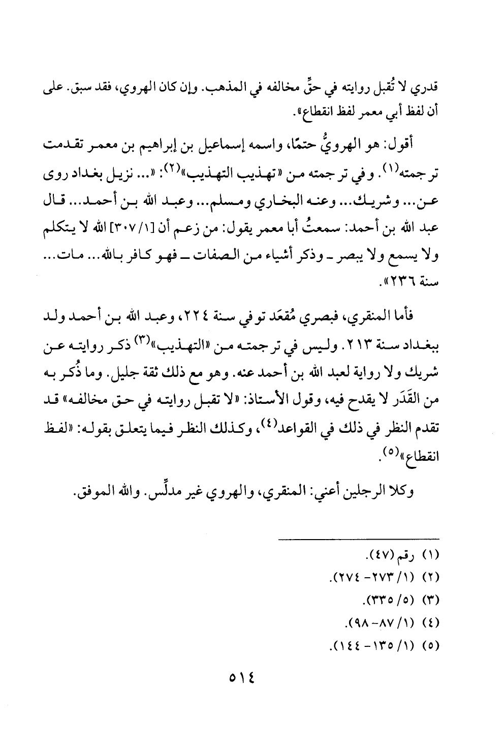 أقول: هو الهرويُّ حتمًا، واسمه إسماعيل بن إبراهيم بن معمر تقدمت ترجمته (¬١). وفي ترجمته من «تهذيب التهذيب» (¬٢): « ... نزيل بغداد روى عن ... وشريك ... وعنه البخاري ومسلم ... وعبد الله بن أحمد ... قال عبد الله بن أحمد: سمعتُ أبا معمر يقول: من زعم أن [١/ ٣٠٧] الله لا يتكلم ولا يسمع ولا يبصر ــ وذكر أشياء من الصفات ــ فهو كافر بالله ... مات ... سنة ٢٣٦».