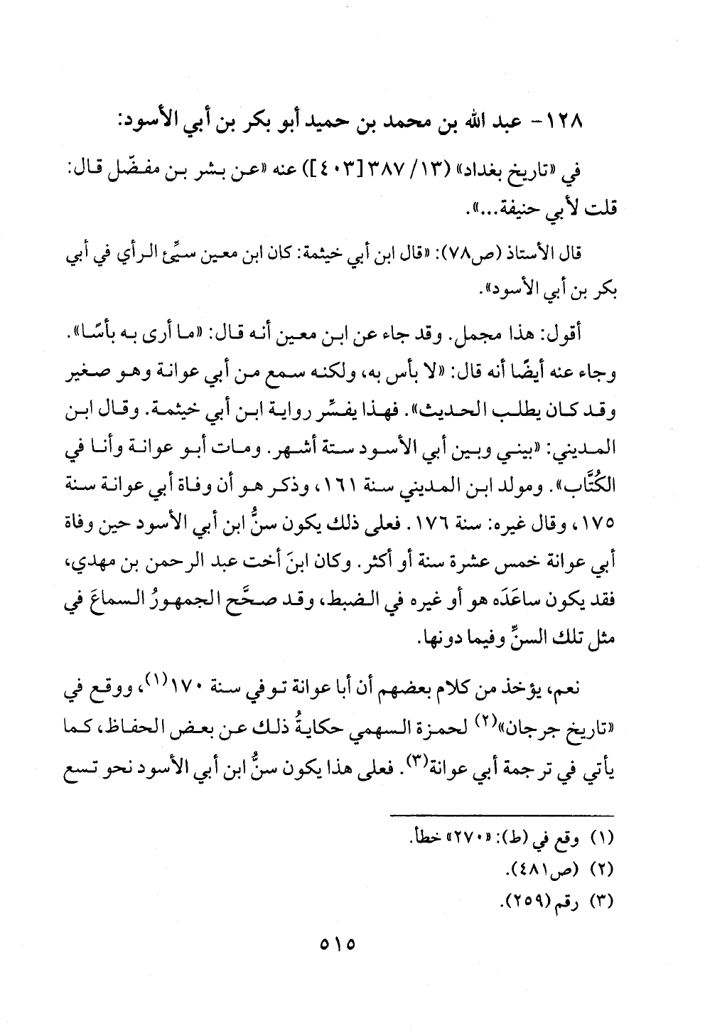 قال الأستاذ (ص ٧٨): «قال ابن أبي خيثمة: كان ابن معين سيِّئ الرأي في أبي بكر بن أبي الأسود».