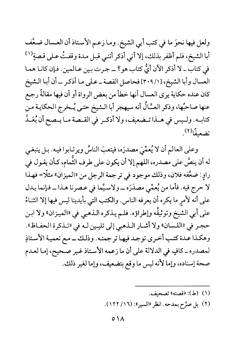 وعلى العالم أن لا يُعمِّيَ مصدرَه، فيتعبَ الناسُ ويرتابوا فيه. بل ينبغي له أن ينصَّ على مصدره، اللهم إلا أن يكون على طرف الثُّمام، كأن يقول في راوٍ: ضعَّفه فلان، وذلك موجود في ترجمة الرجل من «الميزان» مثلًا= فهذا لا حرج فيه. فأما من يُعمِّي مصدَرَه ــ ولاسيَّما في عصرنا هذا ــ فإنما يدل على أنه لأمرٍ ما يكره أن يعرفه الناس. والكتب التي بأيدينا ليس فيها إلا الثناءُ على أبي الشيخ وتوثيقُه وإطراؤه. فلم يذكره الذهبي في «الميزان» ولا ابن حجر في «اللسان» ولا أشار الذهبي إلى تليين له في «تذكرة الحفاظ». وهكذا عدة كتب أخرى توجد فيها ترجمته. وذلك ــ مع تعمية الأستاذِ لمصدره ــ كافٍ في الدلالة على أن ما زعمه الأستاذ غير صحيح، إما لعدم صحة إسناده، وإما لأنه ليس ما وقع بتضعيف، وإما لغير ذلك.