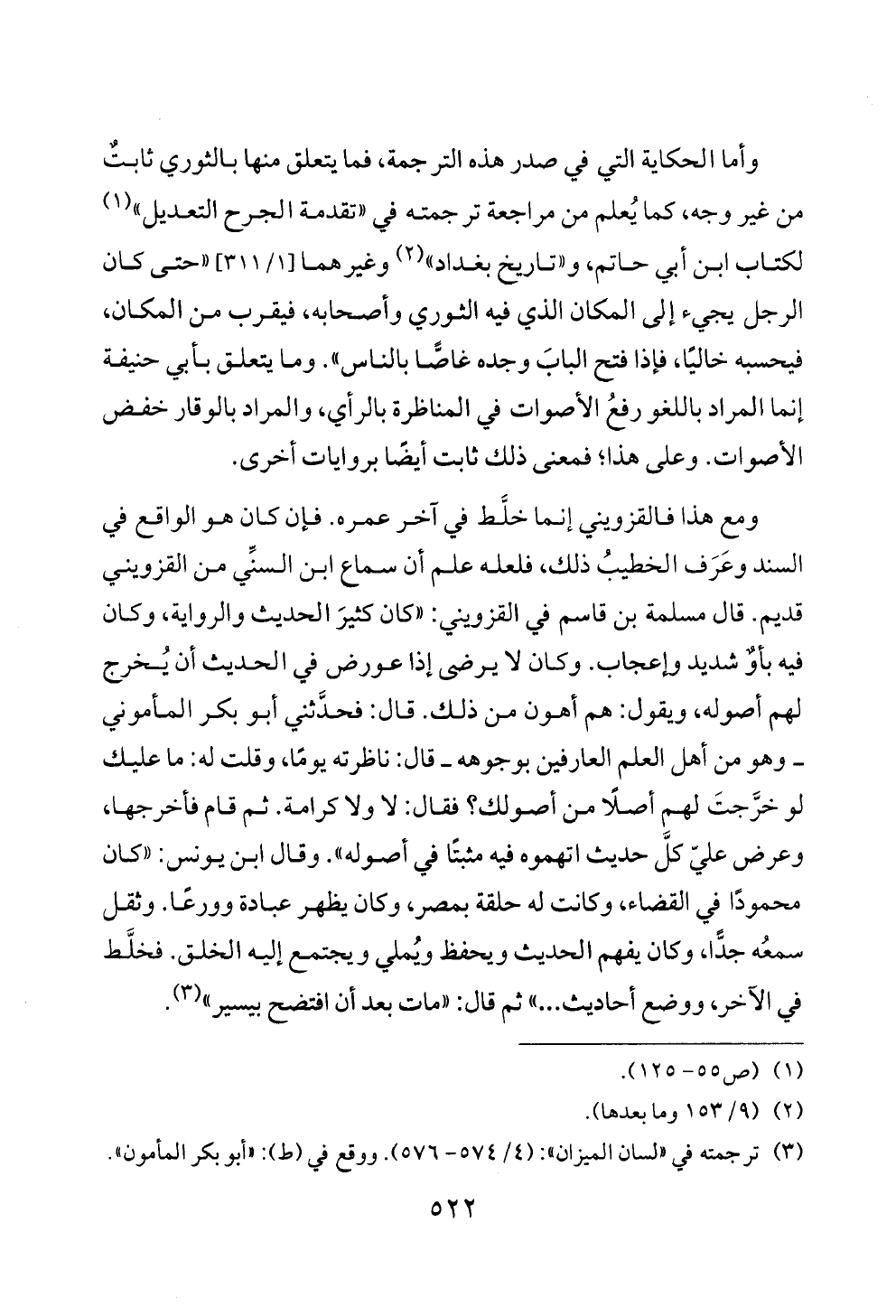 وأما الحكاية التي في صدر هذه الترجمة، فما يتعلق منها بالثوري ثابتٌ من غير وجه، كما يُعلم من مراجعة ترجمته في «تقدمة الجرح التعديل» (¬١) لكتاب ابن أبي حاتم، و «تاريخ بغداد» (¬٢) وغيرهما [١/ ٣١١] «حتى كان الرجل يجيء إلى المكان الذي فيه الثوري وأصحابه، فيقرب من المكان، فيحسبه خاليًا، فإذا فتح البابَ وجده غاصًّا بالناس». وما يتعلق بأبي حنيفة إنما المراد باللغو رفعُ الأصوات في المناظرة بالرأي، والمراد بالوقار خفض الأصوات. وعلى هذا؛ فمعنى ذلك ثابت أيضًا بروايات أخرى.