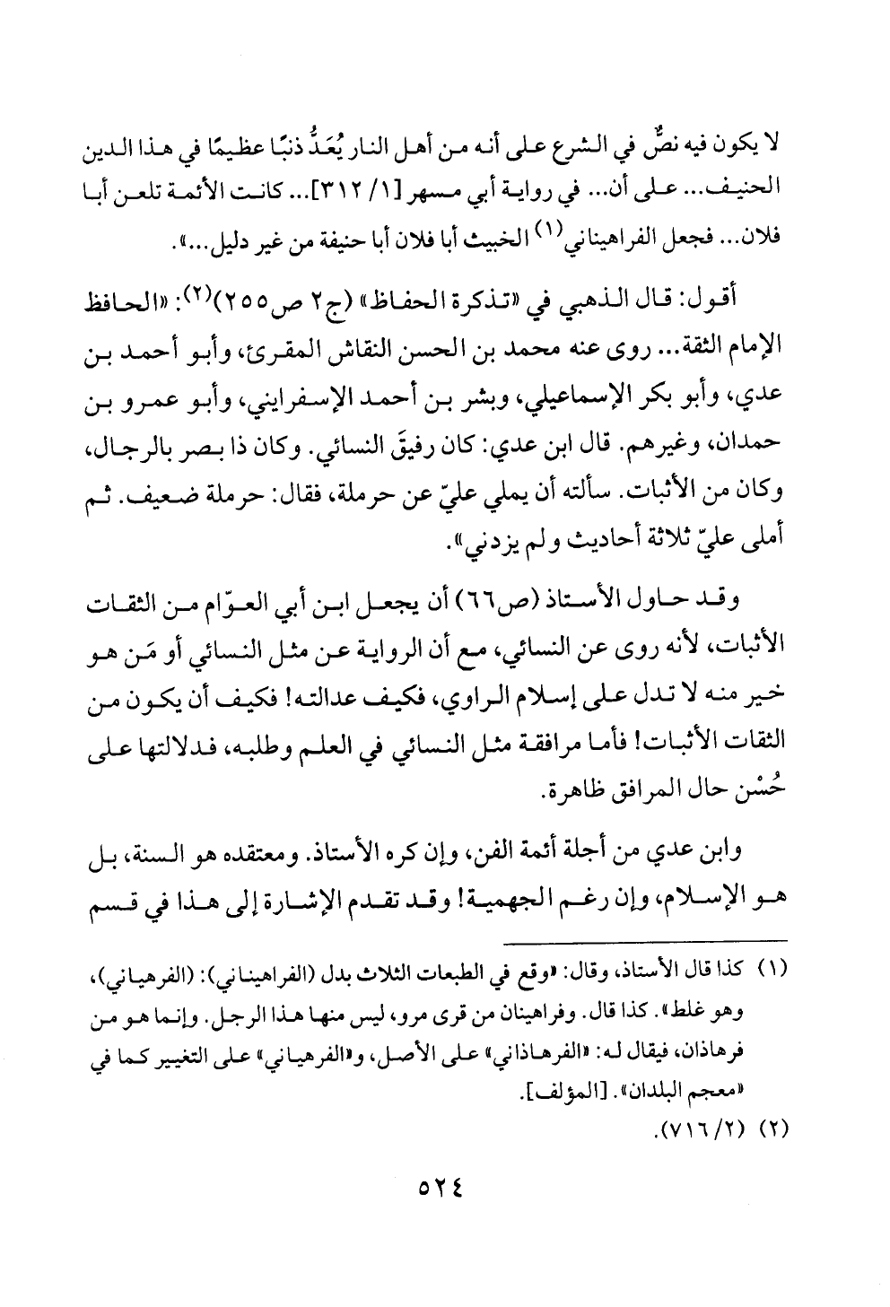 (¬١) كذا قال الأستاذ، وقال: «وقع في الطبعات الثلاث بدل (الفراهيناني): (الفرهياني)، وهو غلط». كذا قال. وفراهينان من قرى مرو، ليس منها هذا الرجل. وإنما هو من فرهاذان، فيقال له: «الفرهاذاني» على الأصل، و «الفرهياني» على التغيير كما في «معجم البلدان». [المؤلف].
