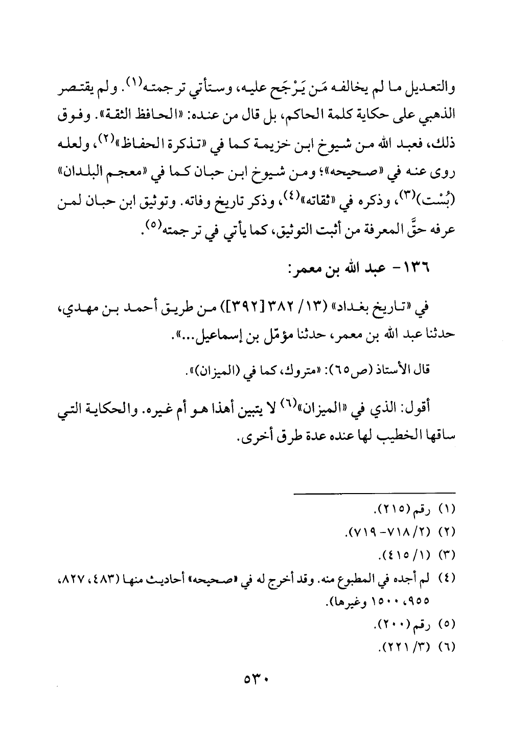 والتعديل ما لم يخالفه مَن يَرْجَح عليه، وستأتي ترجمته (¬١). ولم يقتصر الذهبي على حكاية كلمة الحاكم، بل قال من عنده: «الحافظ الثقة». وفوق ذلك، فعبد الله من شيوخ ابن خزيمة كما في «تذكرة الحفاظ» (¬٢)، ولعله روى عنه في «صحيحه»؛ ومن شيوخ ابن حبان كما في «معجم البلدان» (بُسْت) (¬٣)، وذكره في «ثقاته» (¬٤)، وذكر تاريخ وفاته. وتوثيق ابن حبان لمن عرفه حقَّ المعرفة من أثبت التوثيق، كما يأتي في ترجمته (¬٥).