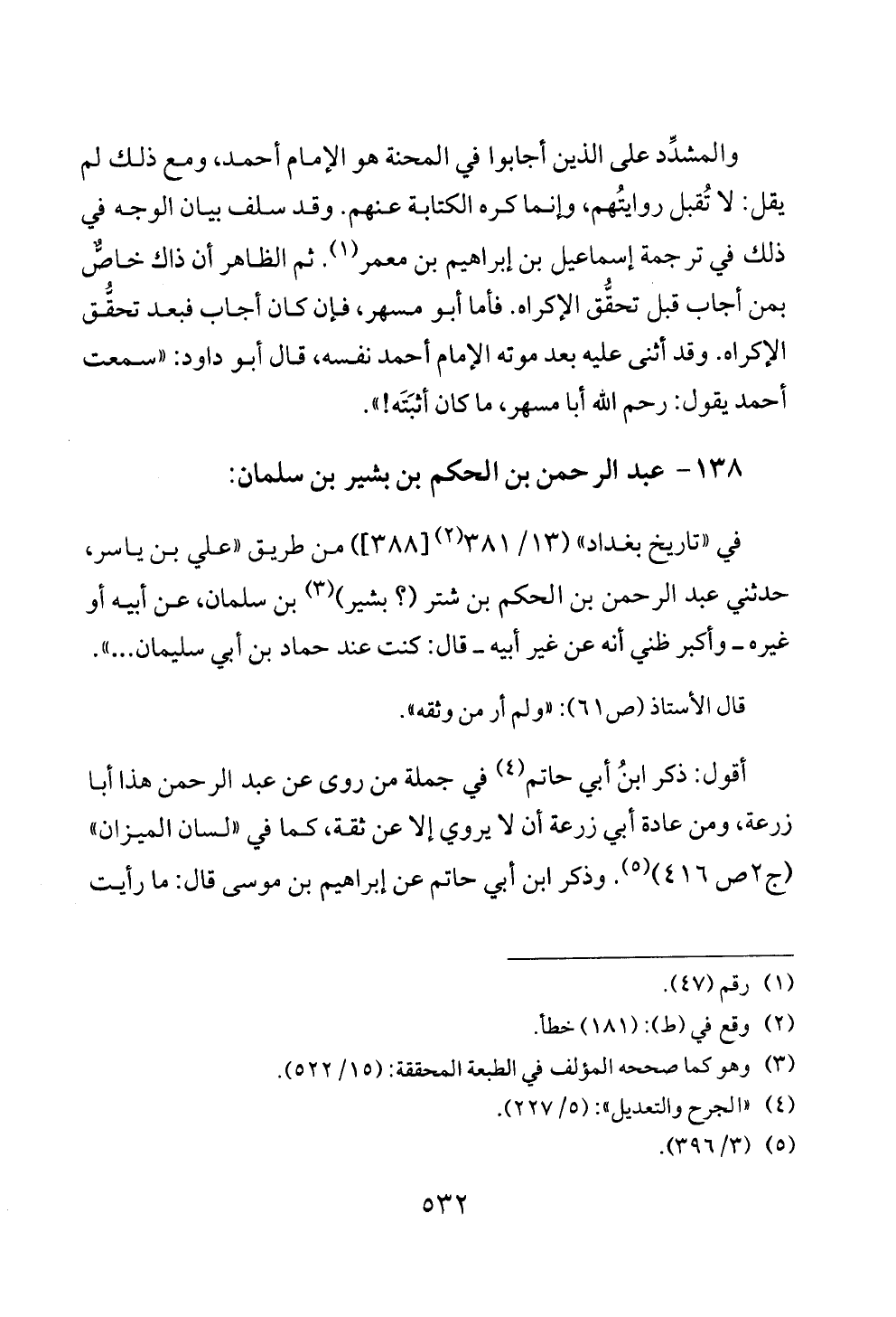 أقول: ذكر ابنُ أبي حاتم (¬٤) في جملة من روى عن عبد الرحمن هذا أبا زرعة، ومن عادة أبي زرعة أن لا يروي إلا عن ثقة، كما في «لسان الميزان» (ج ٢ ص ٤١٦) (¬٥). وذكر ابن أبي حاتم عن إبراهيم بن موسى قال: ما رأيت