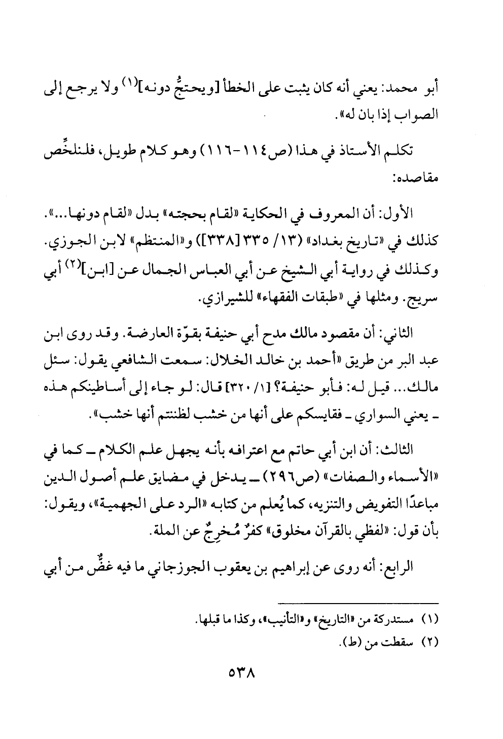 الثالث: أن ابن أبي حاتم مع اعترافه بأنه يجهل علم الكلام ــ كما في «الأسماء والصفات» (ص ٢٩٦) ــ يدخل في مضايق علم أصول الدين مباعدًا التفويض والتنزيه، كما يُعلم من كتابه «الرد على الجهمية»، ويقول: بأن قول: «لفظي بالقرآن مخلوق» كفرٌ مُخرِجٌ عن الملة.