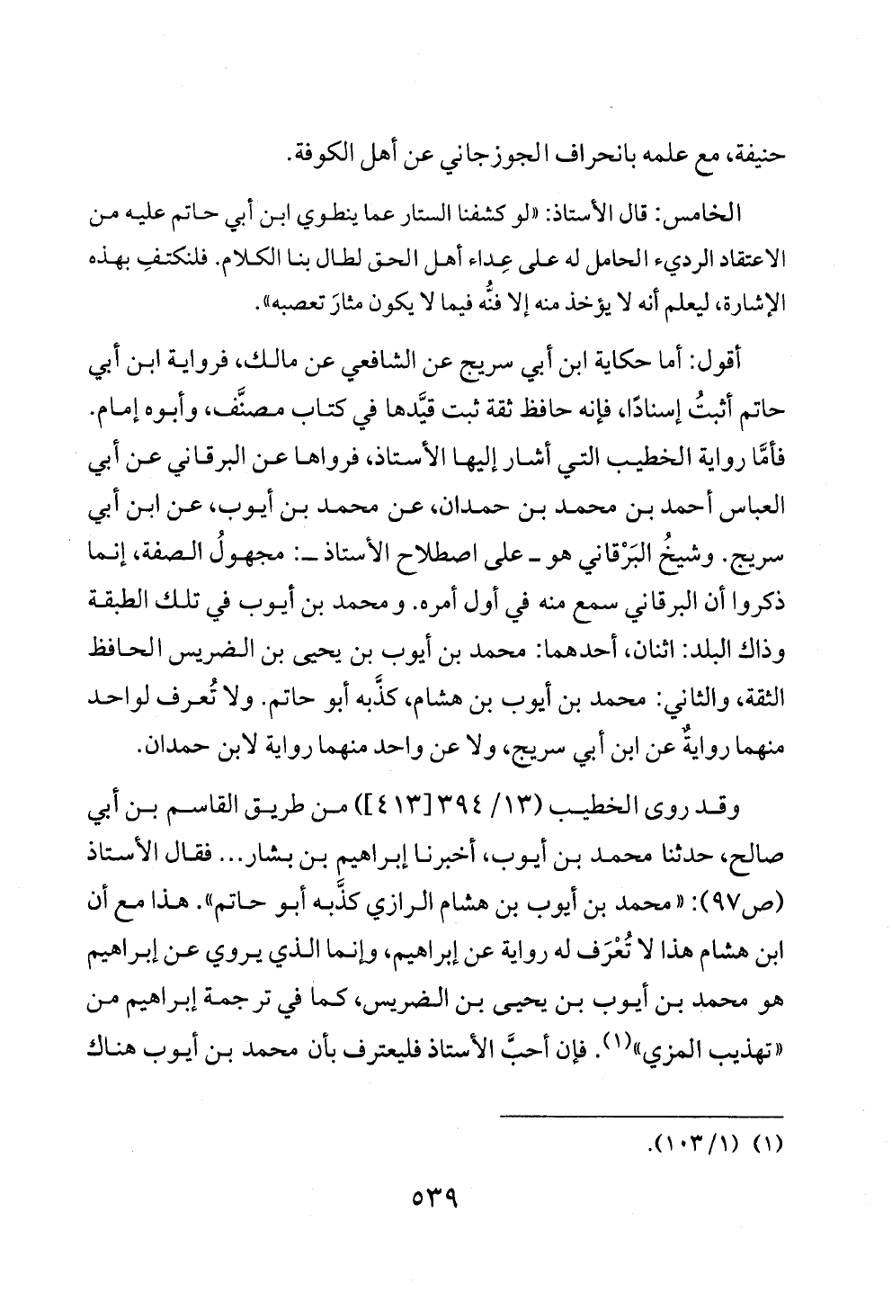 أقول: أما حكاية ابن أبي سريج عن الشافعي عن مالك، فرواية ابن أبي حاتم أثبتُ إسنادًا، فإنه حافظ ثقة ثبت قيَّدها في كتاب مصنَّف، وأبوه إمام. فأمَّا رواية الخطيب التي أشار إليها الأستاذ، فرواها عن البرقاني عن أبي العباس أحمد بن محمد بن حمدان، عن محمد بن أيوب، عن ابن أبي سريج. وشيخُ البَرْقاني هو ــ على اصطلاح الأستاذ ــ: مجهولُ الصفة، إنما ذكروا أن البرقاني سمع منه في أول أمره. ومحمد بن أيوب في تلك الطبقة وذاك البلد: اثنان، أحدهما: محمد بن أيوب بن يحيى بن الضريس الحافظ الثقة، والثاني: محمد بن أيوب بن هشام، كذَّبه أبو حاتم. ولا تُعرف لواحد منهما روايةٌ عن ابن أبي سريج، ولا عن واحد منهما رواية لابن حمدان.
