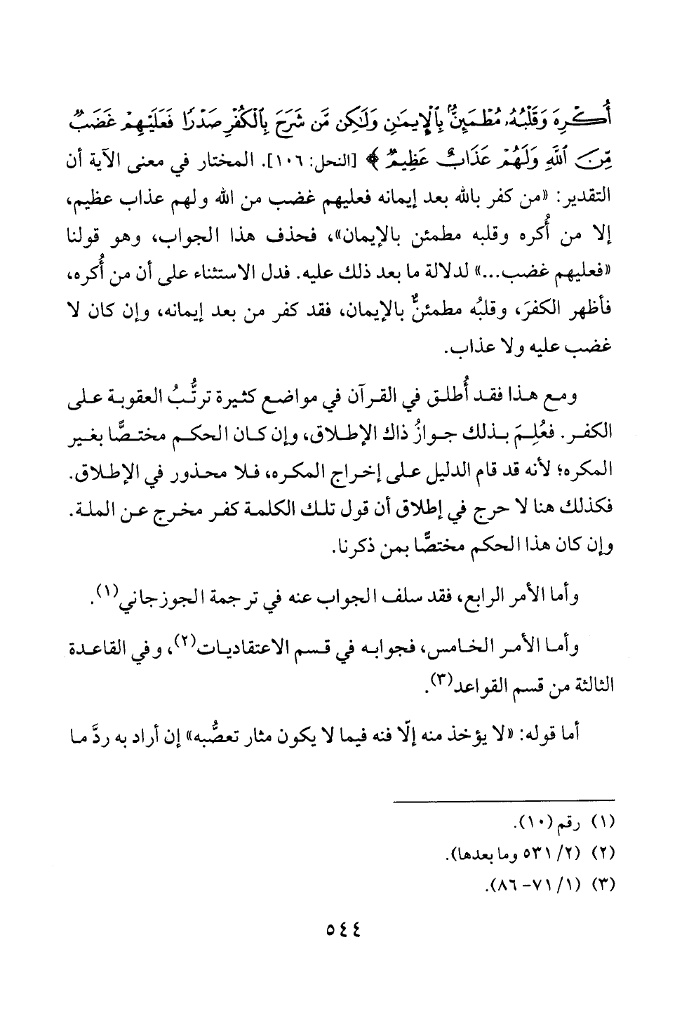 أُكْرِهَ وَقَلْبُهُ مُطْمَئِنٌّ بِالْإِيمَانِ وَلَكِنْ مَنْ شَرَحَ بِالْكُفْرِ صَدْرًا فَعَلَيْهِمْ غَضَبٌ مِنَ اللَّهِ وَلَهُمْ عَذَابٌ عَظِيمٌ} [النحل: (١٠٦)]. المختار في معنى الآية أن التقدير: «من كفر بالله بعد إيمانه فعليهم غضب من الله ولهم عذاب عظيم، إلا من أُكره وقلبه مطمئن بالإيمان»، فحذف هذا الجواب، وهو قولنا «فعليهم غضب ... » لدلالة ما بعد ذلك عليه. فدل الاستثناء على أن من أُكره، فأظهر الكفرَ، وقلبُه مطمئنٌّ بالإيمان، فقد كفر من بعد إيمانه، وإن كان لا غضب عليه ولا عذاب.