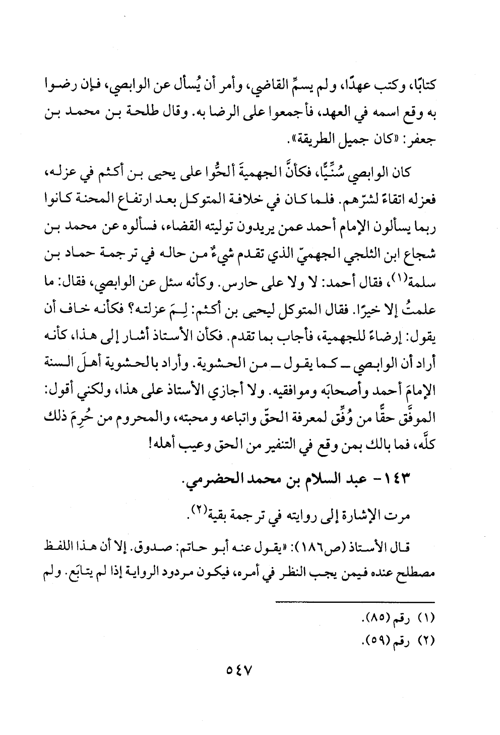 كان الوابصي سُنِّيًّا، فكأنَّ الجهميةَ ألحُّوا على يحيى بن أكثم في عزله، فعزله اتقاءً لشرّهم. فلما كان في خلافة المتوكل بعد ارتفاع المحنة كانوا ربما يسألون الإمام أحمد عمن يريدون توليته القضاء، فسألوه عن محمد بن شجاع ابن الثلجي الجهميّ الذي تقدم شيءٌ من حاله في ترجمة حماد بن سلمة (¬١)، فقال أحمد: لا ولا على حارس. وكأنه سئل عن الوابصي، فقال: ما علمتُ إلا خيرًا. فقال المتوكل ليحيى بن أكثم: لِمَ عزلته؟ فكأنه خاف أن يقول: إرضاءً للجهمية، فأجاب بما تقدم. فكأن الأستاذ أشار إلى هذا، كأنه أراد أن الوابصي ــ كما يقول ــ من الحشوية. وأراد بالحشوية أهلَ السنة الإمامَ أحمد وأصحابَه وموافقيه. ولا أجازي الأستاذ على هذا، ولكني أقول: الموفَّق حقًّا من وُفِّق لمعرفة الحقّ واتباعه ومحبته، والمحروم من حُرِمَ ذلك كلَّه، فما بالك بمن وقع في التنفير من الحق وعيب أهله!