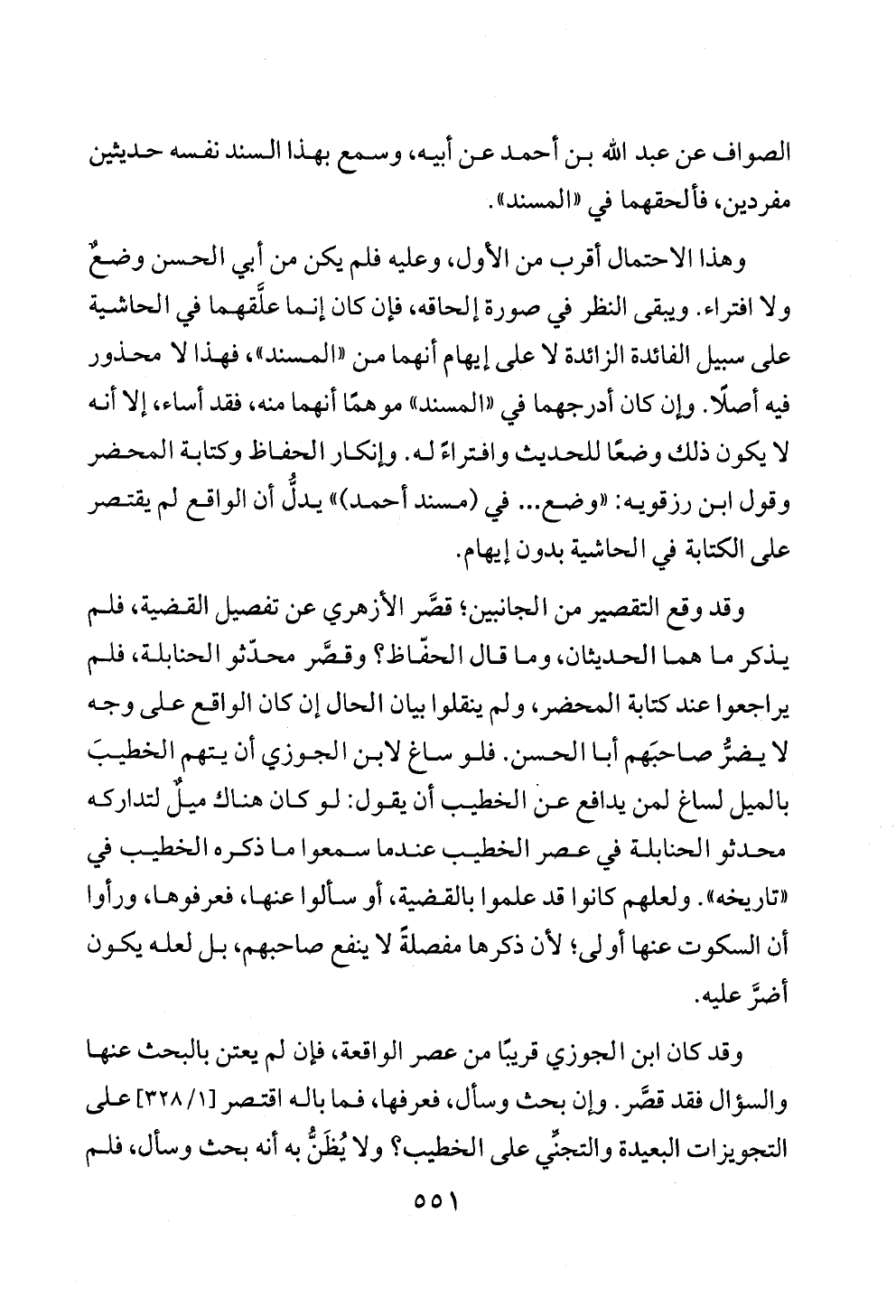 وهذا الاحتمال أقرب من الأول، وعليه فلم يكن من أبي الحسن وضعٌ ولا افتراء. ويبقى النظر في صورة إلحاقه، فإن كان إنما علَّقهما في الحاشية على سبيل الفائدة الزائدة لا على إيهام أنهما من «المسند»، فهذا لا محذور فيه أصلًا. وإن كان أدرجهما في «المسند» موهمًا أنهما منه، فقد أساء، إلا أنه لا يكون ذلك وضعًا للحديث وافتراءً له. وإنكار الحفاظ وكتابة المحضر وقول ابن رزقويه: «وضع ... في (مسند أحمد)» يدلُّ أن الواقع لم يقتصر على الكتابة في الحاشية بدون إيهام.