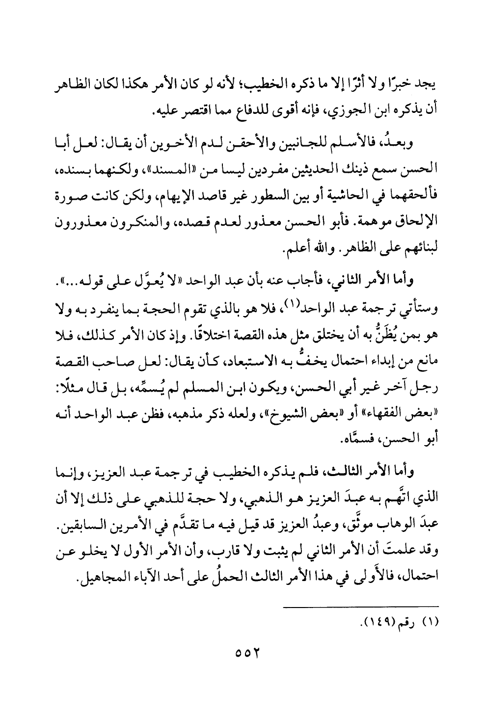 وأما الأمر الثالث، فلم يذكره الخطيب في ترجمة عبد العزيز، وإنما الذي اتَّهم به عبدَ العزيز هو الذهبي، ولا حجة للذهبي على ذلك إلا أن عبدَ الوهاب موثَّق، وعبدُ العزيز قد قيل فيه ما تقدَّم في الأمرين السابقين. وقد علمتَ أن الأمر الثاني لم يثبت ولا قارب، وأن الأمر الأول لا يخلو عن احتمال، فالأَولى في هذا الأمر الثالث الحملُ على أحد الآباء المجاهيل.