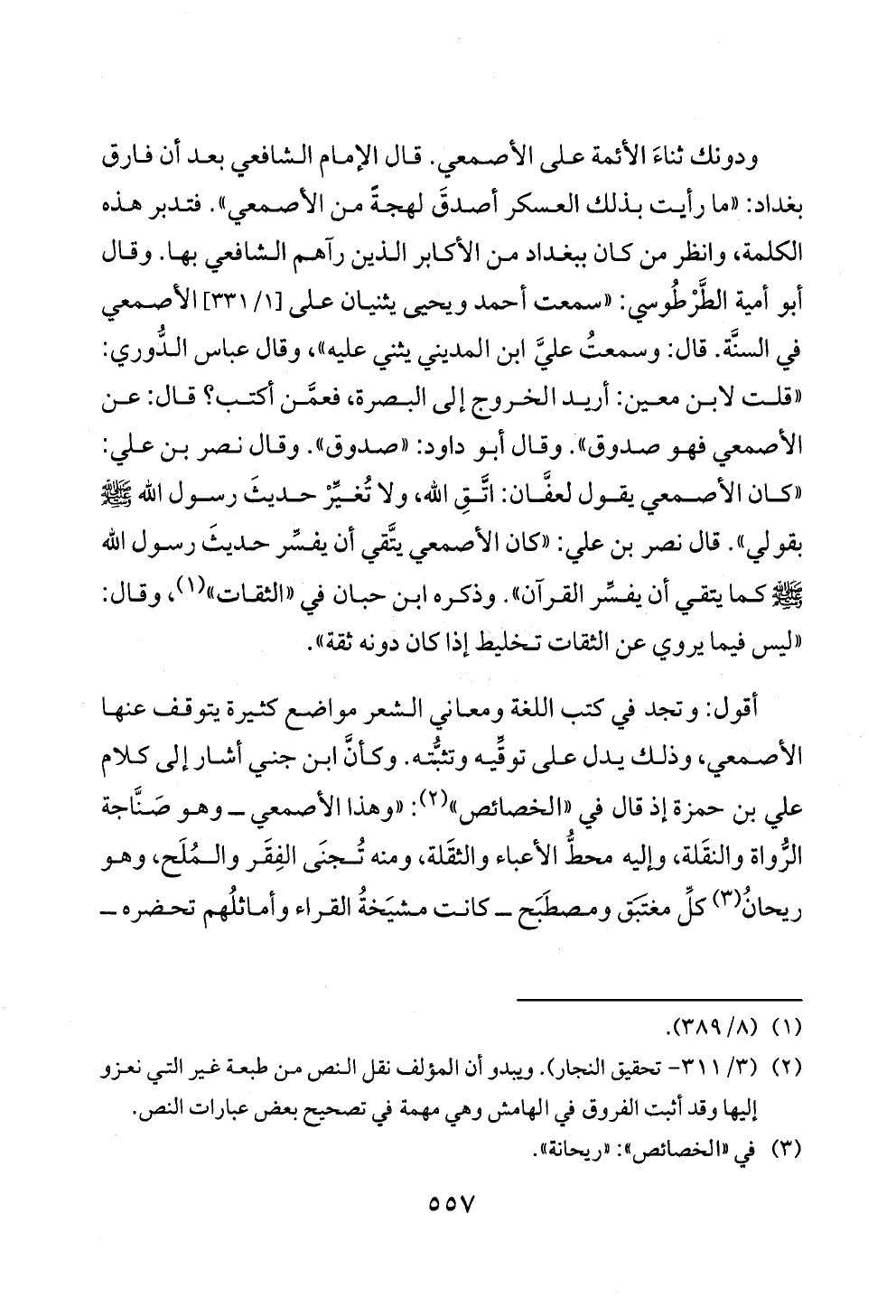ودونك ثناءَ الأئمة على الأصمعي. قال الإمام الشافعي بعد أن فارق بغداد: «ما رأيت بذلك العسكر أصدقَ لهجةً من الأصمعي». فتدبر هذه الكلمة، وانظر من كان ببغداد من الأكابر الذين رآهم الشافعي بها. وقال أبو أمية الطَّرْطُوسي: «سمعت أحمد ويحيى يثنيان على [١/ ٣٣١] الأصمعي في السنَّة. قال: وسمعتُ عليَّ ابن المديني يثني عليه»، وقال عباس الدُّوري: «قلت لابن معين: أريد الخروج إلى البصرة، فعمَّن أكتب؟ قال: عن الأصمعي فهو صدوق». وقال أبو داود: «صدوق». وقال نصر بن علي: «كان الأصمعي يقول لعفَّان: اتَّقِ الله، ولا تُغيِّرْ حديثَ رسول الله - صلى الله عليه وسلم - بقولي». قال نصر بن علي: «كان الأصمعي يتَّقي أن يفسِّر حديثَ رسول الله - صلى الله عليه وسلم - كما يتقي أن يفسِّر القرآن». وذكره ابن حبان في «الثقات» (¬١)، وقال: «ليس فيما يروي عن الثقات تخليط إذا كان دونه ثقة».