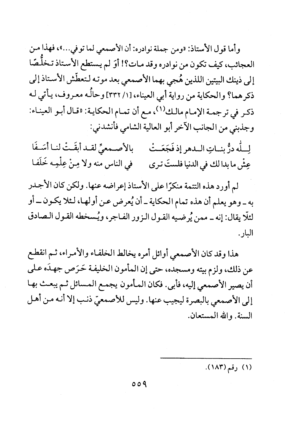 وأما قول الأستاذ: «ومن جملة نوادره: أن الأصمعي لما توفي ... »، فهذا من العجائب، كيف تكون من نوادره وقد مات؟ ! أوَ لم يستطع الأستاذ تخلُّصًا إلى ذينك البيتين اللذين هُجي بهما الأصمعي بعد موته لتعطّش الأستاذ إلى ذكرهما؟ والحكاية من رواية أبي العيناء، [١/ ٣٣٢] وحالُه معروف، يأتي له ذكر في ترجمة الإمام مالك (¬١)، مع أن تمام الحكاية: «قال أبو العيناء: وجذبني من الجانب الآخر أبو العالية الشامي فأنشدني: